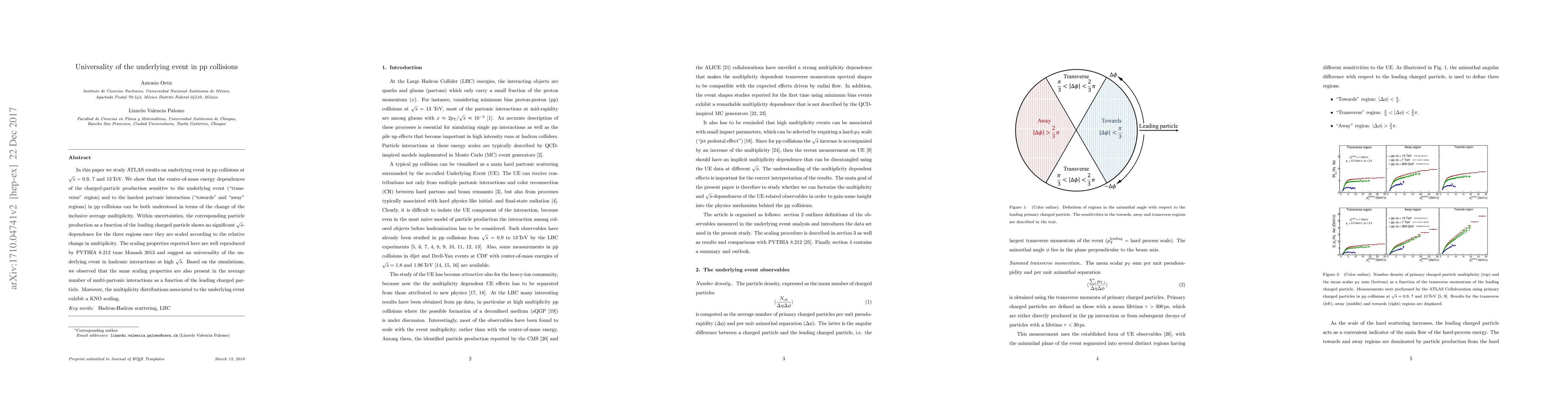 In this paper we study ATLAS results on underlying event in pp collisions at $\sqrt{s}$=0.9, 7 and 13 TeV. We show that the center-of-mass energy dependences of the charged-particle production sensitive to the underlying event ("transverse" region) and to the hardest partonic interaction ("towards" and "away" regions) in pp collisions can be both understood in terms of the change of the inclusive average multiplicity. Within uncertainties, the corresponding particle production as a function of the leading charged particle shows no significant $\sqrt{s}$-dependence for the three regions once they are scaled according to the relative change in multiplicity. The scaling properties reported here are well reproduced by PYTHIA 8.212 tune Monash 2013 and suggest an universality of the underlying event in hadronic interactions at high $\sqrt{s}$. Based on the simulations, we observed that the same scaling properties are also present in the average number of multi-partonic interactions as a function of the leading charged particle. Moreover, the multiplicity distributions associated to the underlying event exhibit a KNO scaling.