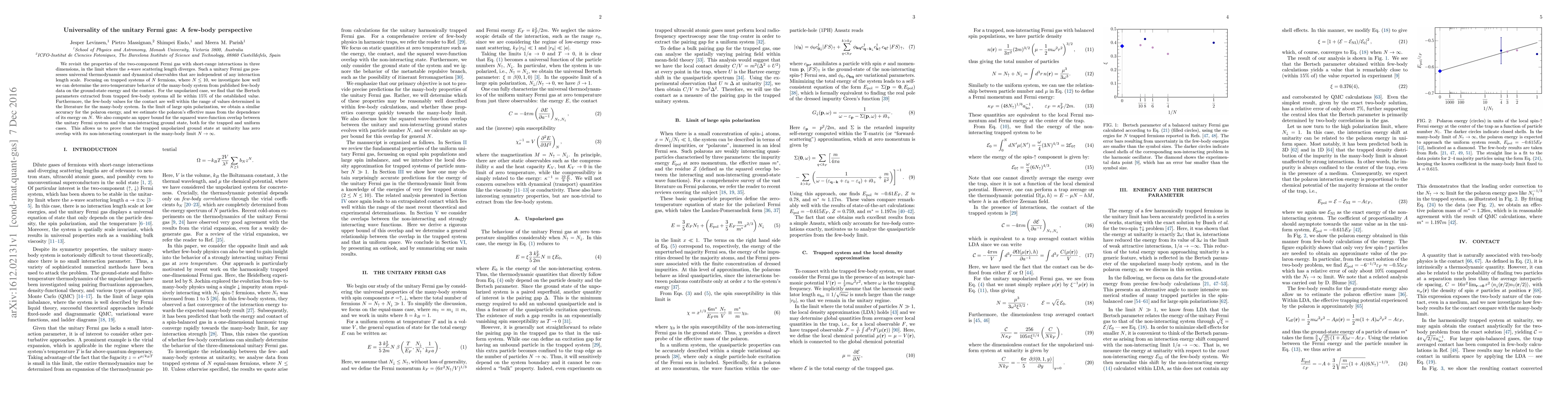 We revisit the properties of the two-component Fermi gas with short-range interactions in three dimensions, in the limit where the s-wave scattering length diverges. Such a unitary Fermi gas possesses universal thermodynamic and dynamical observables that are independent of any interaction length scale. Focusing on trapped systems of N fermions, where N$\leq10$, we investigate how well we can determine the zero-temperature behavior of the many-body system from published few-body data on the ground-state energy and the contact. For the unpolarized case, we find that the Bertsch parameters extracted from trapped few-body systems all lie within 15% of the established value. Furthermore, the few-body values for the contact are well within the range of values determined in the literature for the many-body system. In the limit of large spin polarization, we obtain a similar accuracy for the polaron energy, and we estimate the polaron's effective mass from the dependence of its energy on N. We also compute an upper bound for the squared wave-function overlap between the unitary Fermi system and the non-interacting ground state, both for the trapped and uniform cases. This allows us to prove that the trapped unpolarised ground state at unitarity has zero overlap with its non-interacting counterpart in the many-body limit N$\to \infty$.