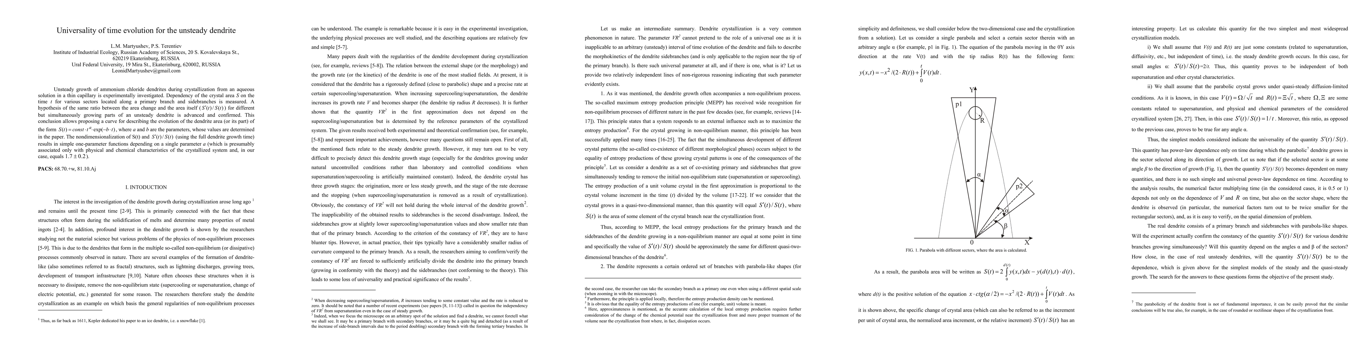 Unsteady growth of ammonium chloride dendrites during crystallization from an aqueous solution in a thin capillary is experimentally investigated. Dependency of the crystal area S on the time t for various sectors located along a primary branch and sidebranches is measured. A hypothesis of the same ratio between the area change and the area itself (S'(t)/S(t)) for different but simultaneously growing parts of an unsteady dendrite is advanced and confirmed. This conclusion allows proposing a curve for describing the evolution of the dendrite area (or its part) of the form S(t)=const*exp(-b*t)*t^a, where a and b are the parameters, whose values are determined in the paper. The nondimensionalization of S(t) and S'(t)/S(t) (using the full dendrite growth time) results in simple one-parameter functions depending on a single parameter (a) (which is presumably associated only with physical and chemical characteristics of the crystallized system and, in our case, equals 1.7+/-0.2).