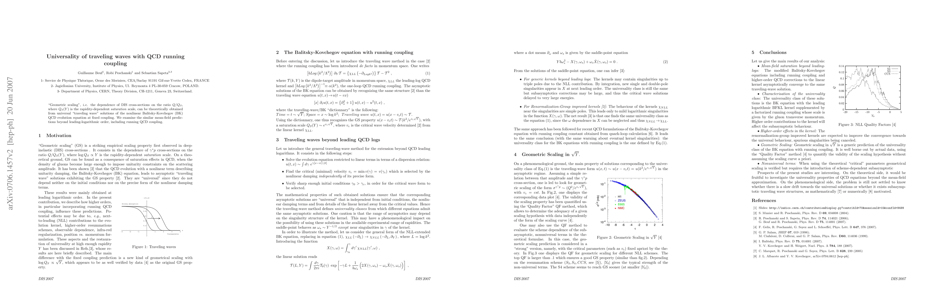 This paper investigates the universality of traveling wave solutions in the nonlinear Balitsky-Kovchegov (BK) equation for Quantum Chromodynamics (QCD) with a running coupling, aiming to understand the geometric scaling in deep inelastic scattering (DIS) cross-sections. The study extends beyond leading-logarithmic order to include the effects of a varying QCD coupling.