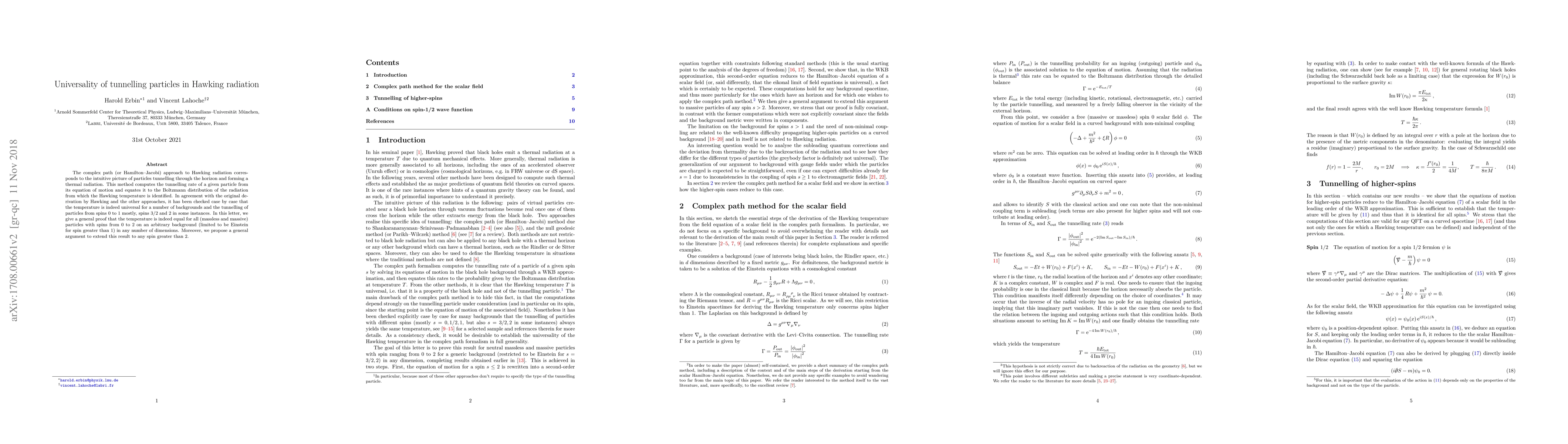 The complex path (or Hamilton-Jacobi) approach to Hawking radiation corresponds to the intuitive picture of particles tunnelling through the horizon and forming a thermal radiation. This method computes the tunnelling rate of a given particle from its equation of motion and equates it to the Boltzmann distribution of the radiation from which the Hawking temperature is identified. In agreement with the original derivation by Hawking and the other approaches, it has been checked case by case that the temperature is indeed universal for a number of backgrounds and the tunnelling of particles from spins $0$ to $1$ mostly, spins $3/2$ and $2$ in some instances. In this letter, we give a general proof that the temperature is indeed equal for all (massless and massive) particles with spins from $0$ to $2$ on an arbitrary background (limited to be Einstein for spin greater than $1$) in any number of dimensions. Moreover, we propose a general argument to extend this result to any spin greater than $2$.