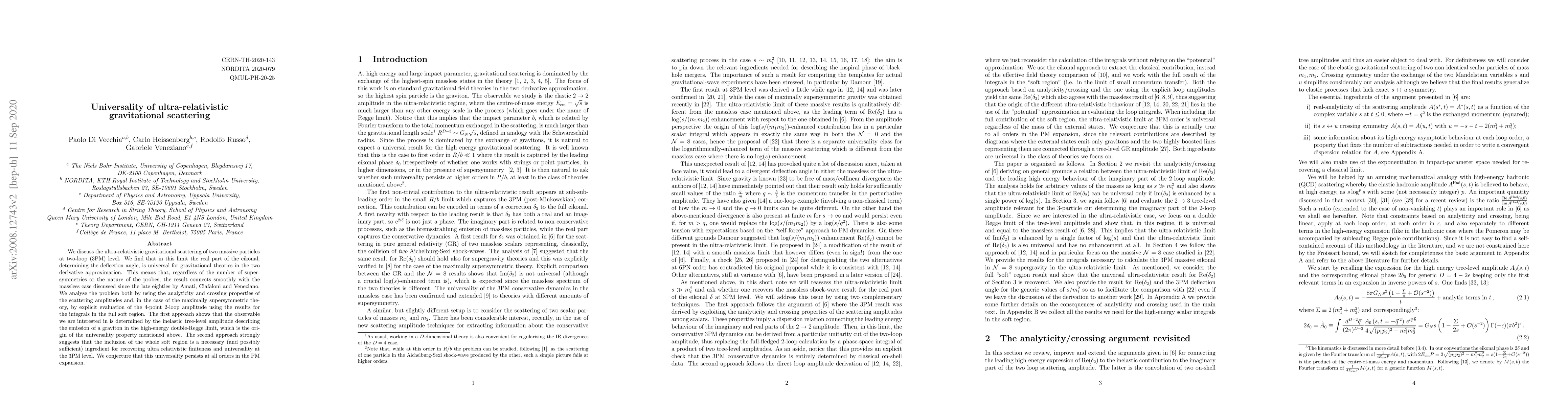 We discuss the ultra-relativistic gravitational scattering of two massive particles at two-loop (3PM) level. We find that in this limit the real part of the eikonal, determining the deflection angle, is universal for gravitational theories in the two derivative approximation. This means that, regardless of the number of supersymmetries or the nature of the probes, the result connects smoothly with the massless case discussed since the late eighties by Amati, Ciafaloni and Veneziano. We analyse the problem both by using the analyticity and crossing properties of the scattering amplitudes and, in the case of the maximally supersymmetric theory, by explicit evaluation of the 4-point 2-loop amplitude using the results for the integrals in the full soft region. The first approach shows that the observable we are interested in is determined by the inelastic tree-level amplitude describing the emission of a graviton in the high-energy double-Regge limit, which is the origin of the universality property mentioned above. The second approach strongly suggests that the inclusion of the whole soft region is a necessary (and possibly sufficient) ingredient for recovering ultra relativistic finiteness and universality at the 3PM level. We conjecture that this universality persists at all orders in the PM expansion.