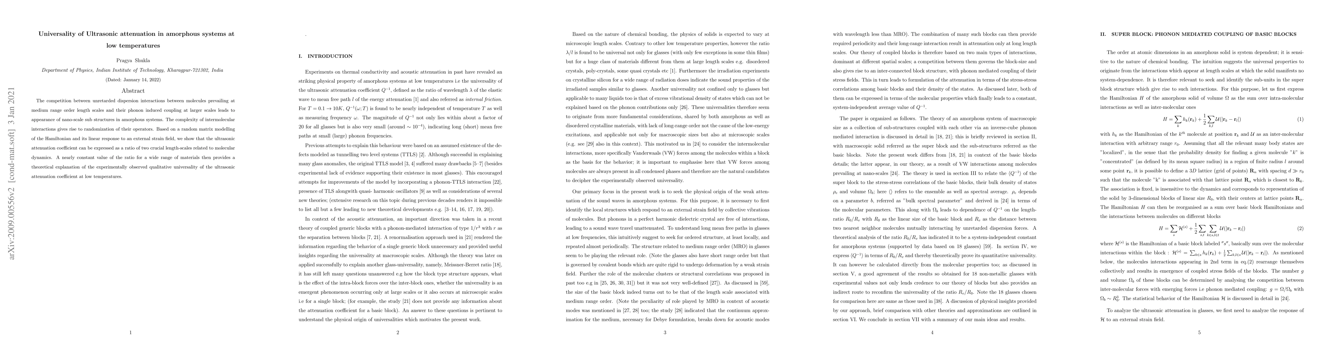 The competition between unretarded dispersion interactions between molecules prevailing at medium range order length scales and their phonon induced coupling at larger scales leads to appearance of nano-scale sub structures in amorphous systems. The complexity of intermolecular interactions gives rise to randomization of their operators. Based on a random matrix modelling of the Hamiltonian and its linear response to an external strain field, we show that the ultrasonic attenuation coefficient can be expressed as a ratio of two crucial length-scales related to molecular dynamics. A constant value of the ratio for a wide range of materials then provides a theoretical explanation of the experimentally observed universality of the ultrasonic attenuation coefficient at low temperatures.