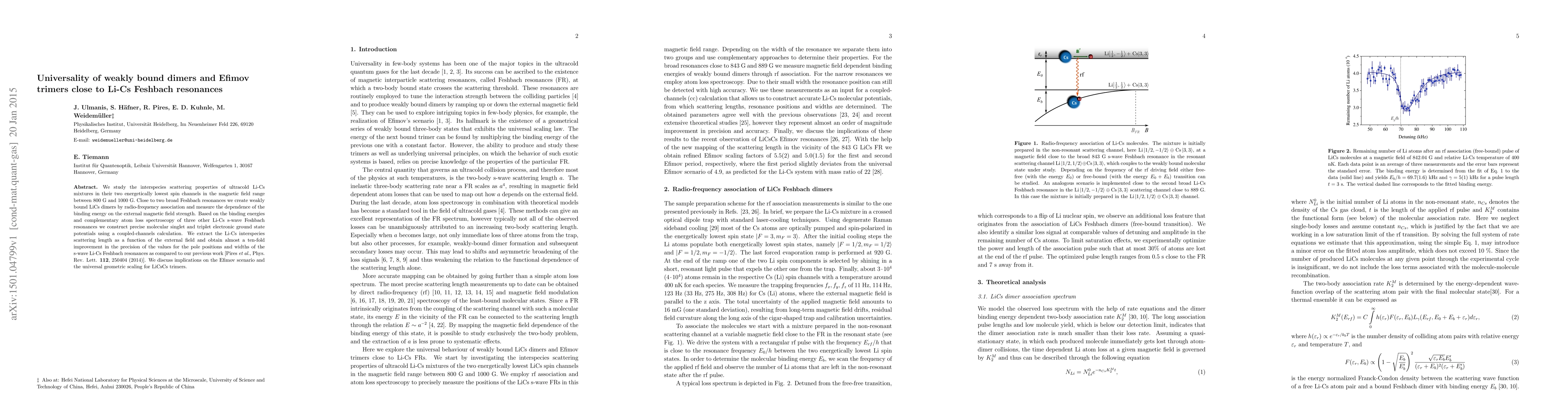 This paper investigates the interspecies scattering properties of ultracold Li-Cs mixtures near two Feshbach resonances, creating weakly bound LiCs dimers and measuring their binding energy. It reports a significant improvement in precision for the pole positions and widths of s-wave Li-Cs Feshbach resonances, discussing implications for Efimov trimers and universal geometric scaling.