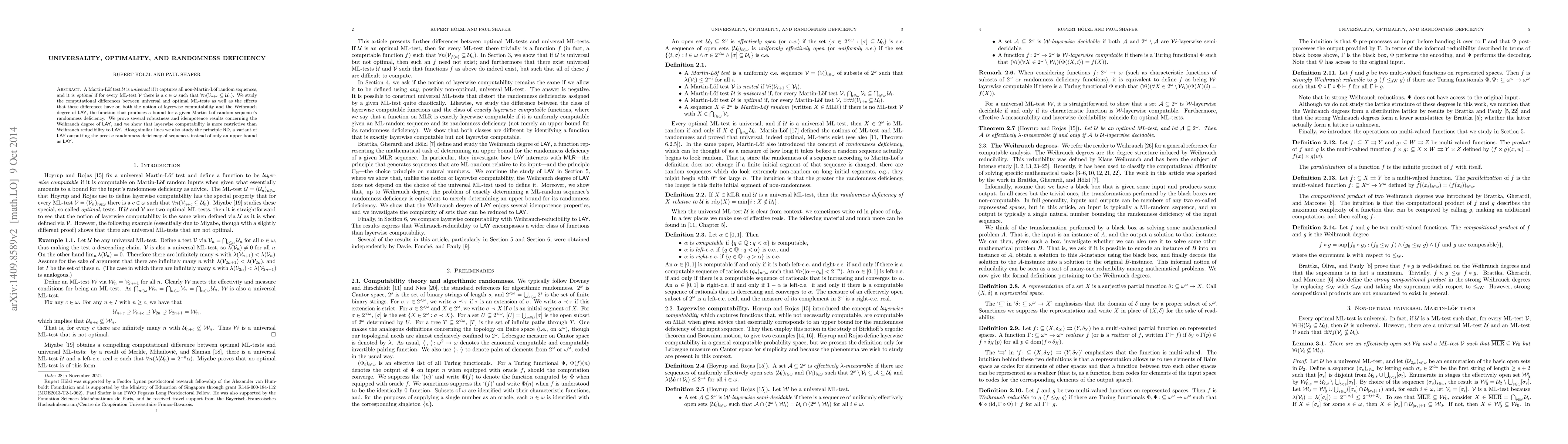 A Martin-L\"of test $\mathcal U$ is universal if it captures all non-Martin-L\"of random sequences, and it is optimal if for every ML-test $\mathcal V$ there is a $c \in \omega$ such that $\forall n(\mathcal{V}_{n+c} \subseteq \mathcal{U}_n)$. We study the computational differences between universal and optimal ML-tests as well as the effects that these differences have on both the notion of layerwise computability and the Weihrauch degree of LAY, the function that produces a bound for a given Martin-L\"of random sequence's randomness deficiency. We prove several robustness and idempotence results concerning the Weihrauch degree of LAY, and we show that layerwise computability is more restrictive than Weihrauch reducibility to LAY. Along similar lines we also study the principle RD, a variant of LAY outputting the precise randomness deficiency of sequences instead of only an upper bound as LAY.
