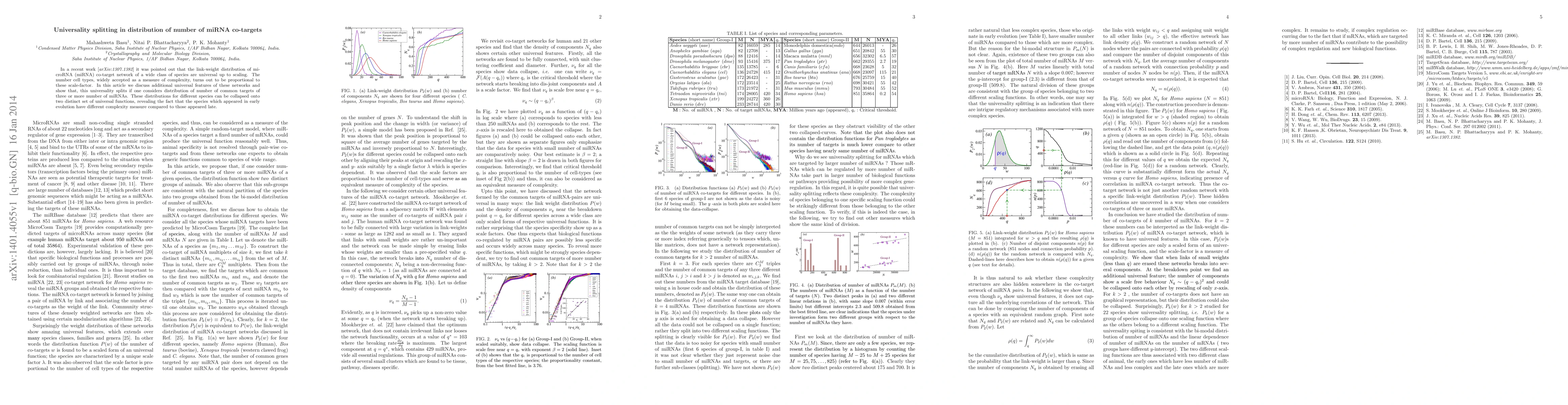 In a recent work [arXiv:1307.1382] it was pointed out that the link-weight distribution of microRNA (miRNA) co-target network of a wide class of species are universal up to scaling. The number cell types, widely accepted as a measure of complexity, turns out to be proportional to these scale-factor. In this article we discuss additional universal features of these networks and show that, this universality splits if one considers distribution of number of common targets of three or more number of miRNAs. These distributions for different species can be collapsed onto two distinct set of universal functions, revealing the fact that the species which appeared in early evolution have different complexity measure compared to those appeared late.