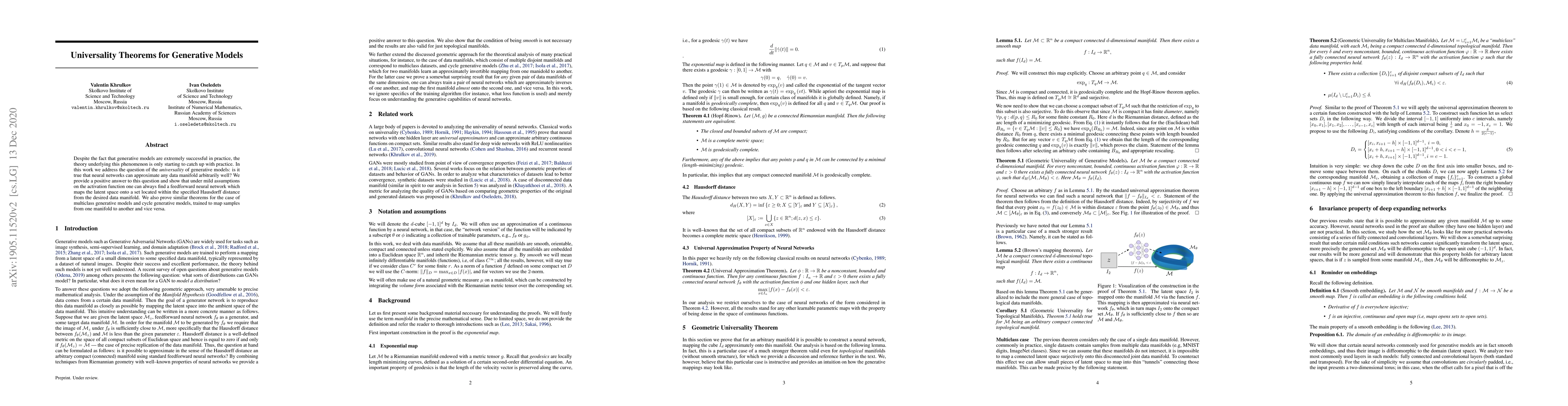 Despite the fact that generative models are extremely successful in practice, the theory underlying this phenomenon is only starting to catch up with practice. In this work we address the question of the universality of generative models: is it true that neural networks can approximate any data manifold arbitrarily well? We provide a positive answer to this question and show that under mild assumptions on the activation function one can always find a feedforward neural network that maps the latent space onto a set located within the specified Hausdorff distance from the desired data manifold. We also prove similar theorems for the case of multiclass generative models and cycle generative models, trained to map samples from one manifold to another and vice versa.