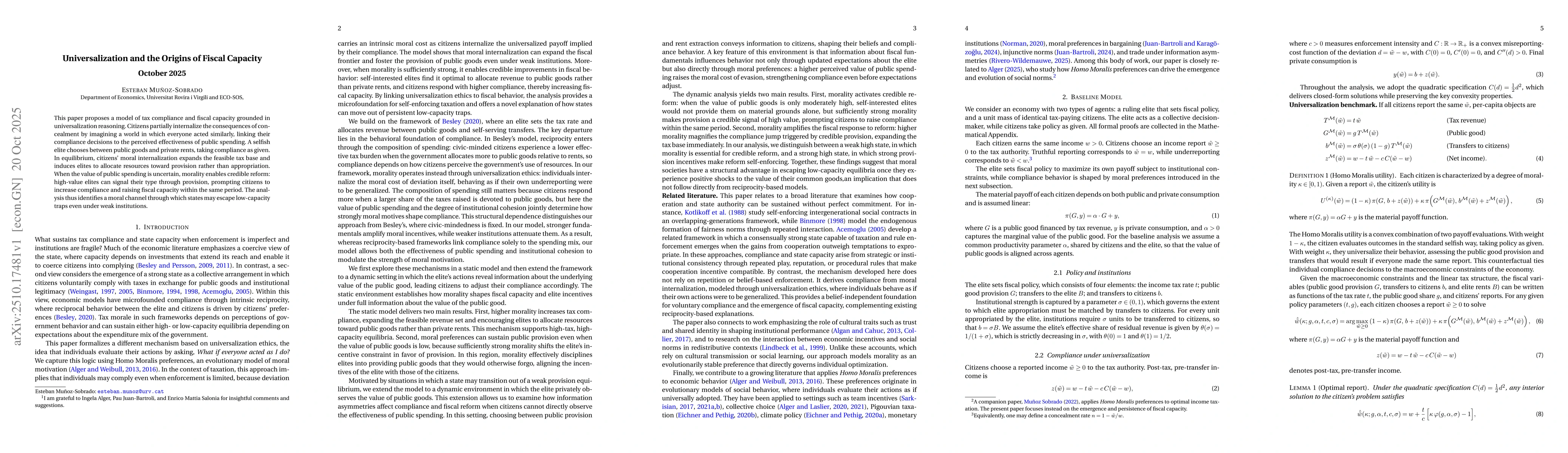This paper proposes a model of tax compliance and fiscal capacity grounded in universalization reasoning. Citizens partially internalize the consequences of concealment by imagining a world in which everyone acted similarly, linking their compliance decisions to the perceived effectiveness of public spending. A selfish elite chooses between public goods and private rents, taking compliance as given. In equilibrium, citizens' moral internalization expands the feasible tax base and induces elites to allocate resources toward provision rather than appropriation. When the value of public spending is uncertain, morality enables credible reform: high-value elites can signal their type through provision, prompting citizens to increase compliance and raising fiscal capacity within the same period. The analysis thus identifies a moral channel through which states may escape low-capacity traps even under weak institutions.