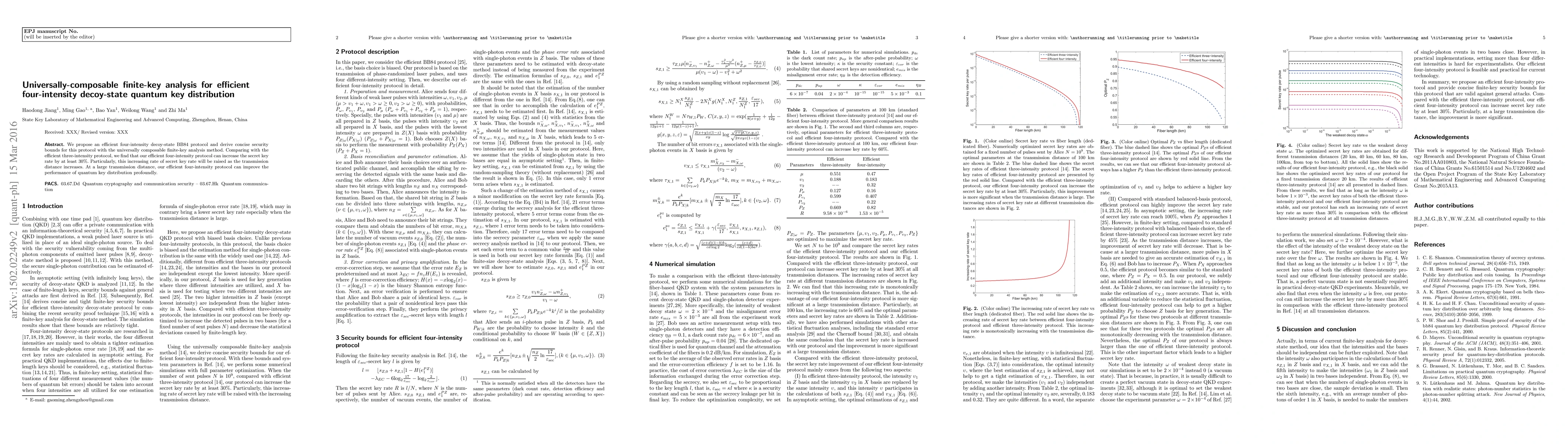 This paper proposes an efficient four-intensity decoy-state BB84 protocol for quantum key distribution, deriving security bounds using universally composable finite-key analysis. The four-intensity protocol increases the secret key rate by at least 30% compared to the three-intensity version, with the improvement becoming more significant at greater transmission distances.