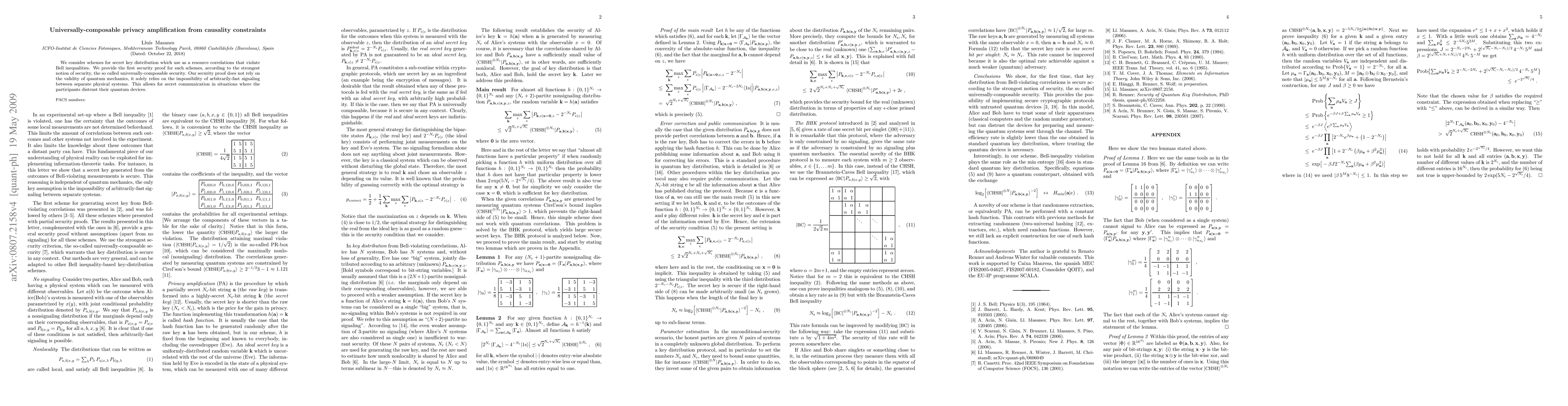 This paper presents the first security proof for secret key distribution schemes using correlations violating Bell inequalities under universally-composable security, without relying on quantum mechanics, only on the impossibility of fast signaling between separate systems. This enables secure communication even when participants distrust their quantum devices.