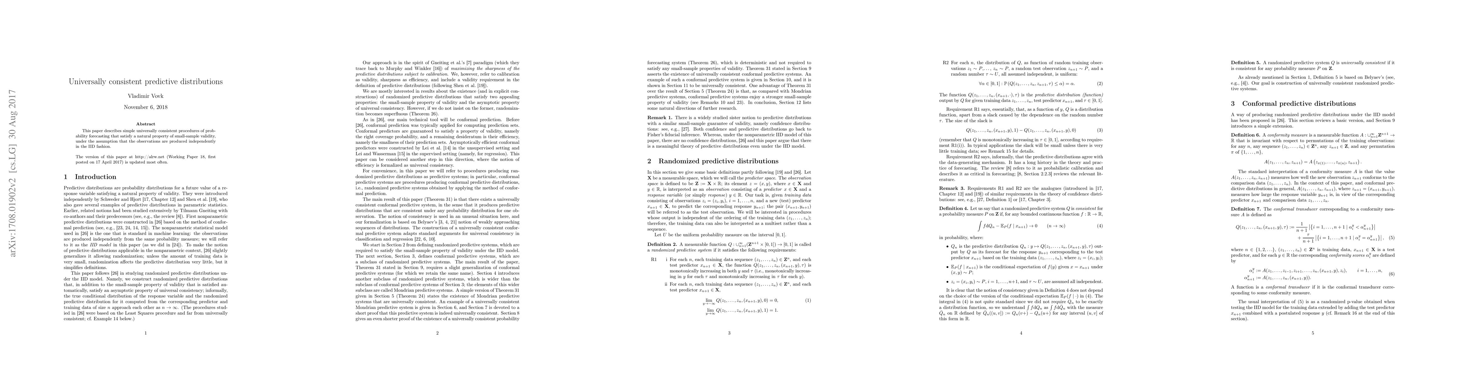 This paper proposes universally consistent procedures for probabilistic forecasting that maintain small-sample validity, assuming observations are independently and identically distributed (IID). These methods ensure accurate predictive distributions across various datasets.