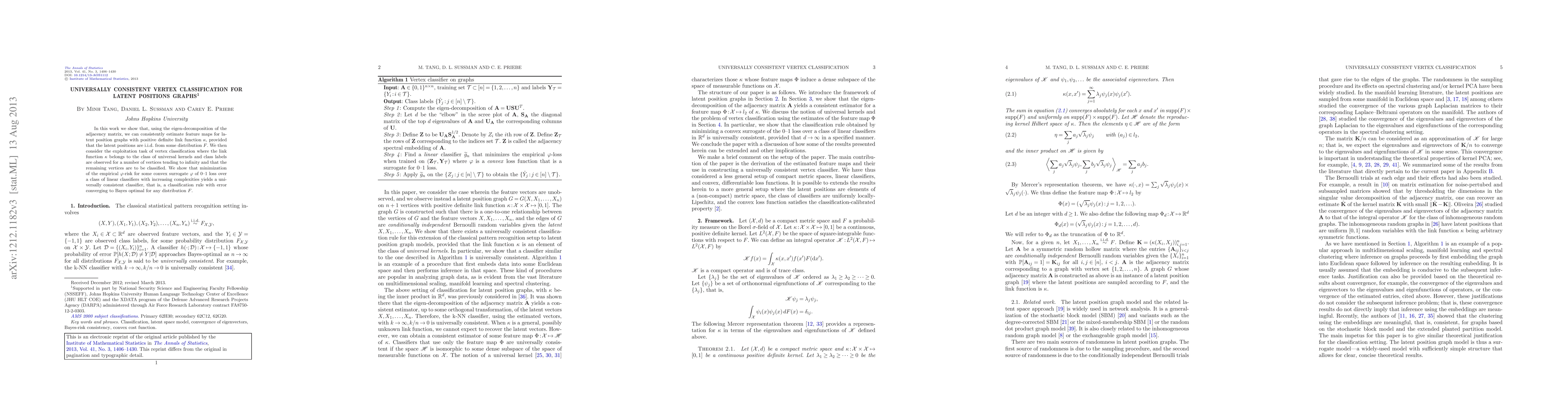 This research introduces a method for consistently estimating feature maps in latent position graphs using eigen-decomposition of the adjacency matrix. It also presents a universally consistent vertex classification approach for kernels with increasing complexities, ensuring error convergence to Bayes optimal for any distribution F.
