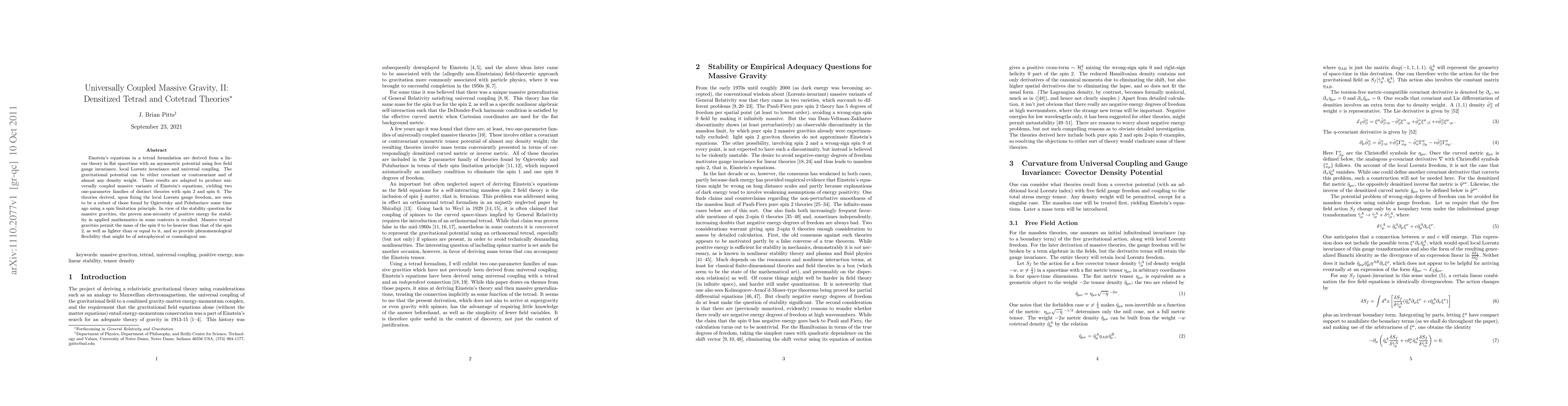 Einstein's equations in a tetrad formulation are derived from a linear theory in flat spacetime with an asymmetric potential using free field gauge invariance, local Lorentz invariance and universal coupling. The gravitational potential can be either covariant or contravariant and of almost any density weight. These results are adapted to produce universally coupled massive variants of Einstein's equations, yielding two one-parameter families of distinct theories with spin 2 and spin 0. The theories derived, upon fixing the local Lorentz gauge freedom, are seen to be a subset of those found by Ogievetsky and Polubarinov some time ago using a spin limitation principle. In view of the stability question for massive gravities, the proven non-necessity of positive energy for stability in applied mathematics in some contexts is recalled. Massive tetrad gravities permit the mass of the spin 0 to be heavier than that of the spin 2, as well as lighter than or equal to it, and so provide phenomenological flexibility that might be of astrophysical or cosmological use.
