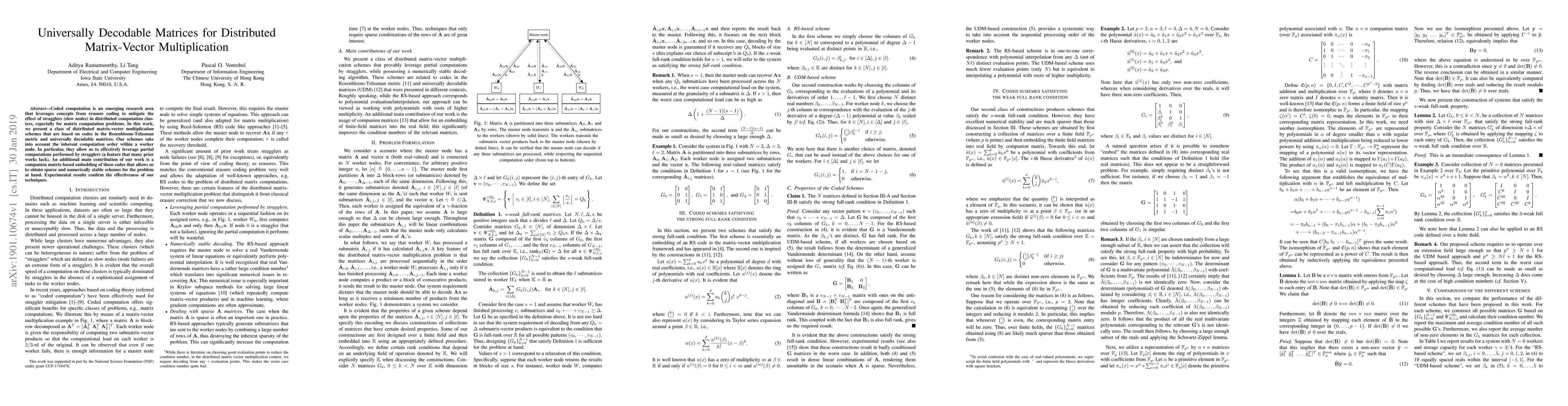 This paper introduces a novel class of distributed matrix-vector multiplication schemes using Rosenbloom-Tsfasman codes and universally decodable matrices to handle stragglers in computation clusters. The proposed methods effectively utilize partial computations from slow nodes and provide sparse, numerically stable solutions, as confirmed by experimental results.