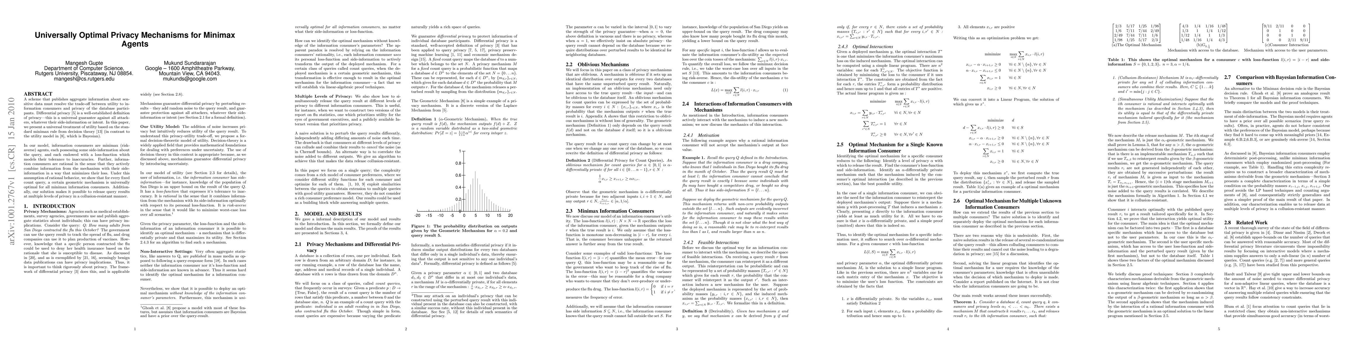 This paper proposes a universal optimal privacy mechanism for minimax agents, balancing utility and privacy using differential privacy. It demonstrates a geometric mechanism that is optimal for all risk-averse information consumers, allowing for multiple privacy levels in a collusion-resistant manner.