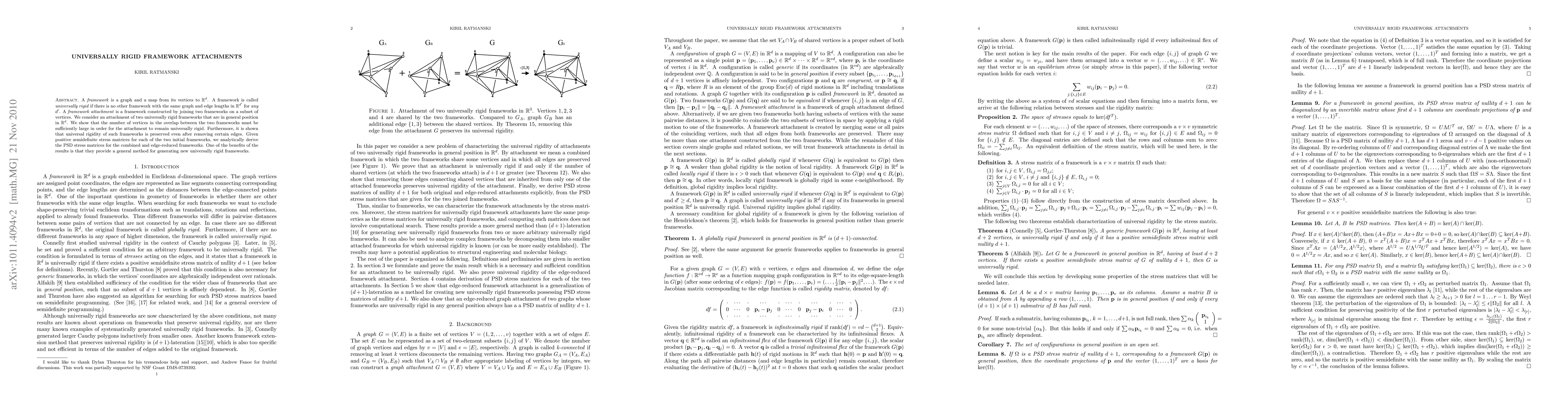 A framework is a graph and a map from its vertices to R^d. A framework is called universally rigid if there is no other framework with the same graph and edge lengths in R^d' for any d'. A framework attachment is a framework constructed by joining two frameworks on a subset of vertices. We consider an attachment of two universally rigid frameworks that are in general position in R^d. We show that the number of vertices in the overlap between the two frameworks must be sufficiently large in order for the attachment to remain universally rigid. Furthermore, it is shown that universal rigidity of such frameworks is preserved even after removing certain edges. Given positive semidefinite stress matrices for each of the two initial frameworks, we analytically derive the PSD stress matrices for the combined and edge-reduced frameworks. One of the benefits of the results is that they provide a general method for generating new universally rigid frameworks.