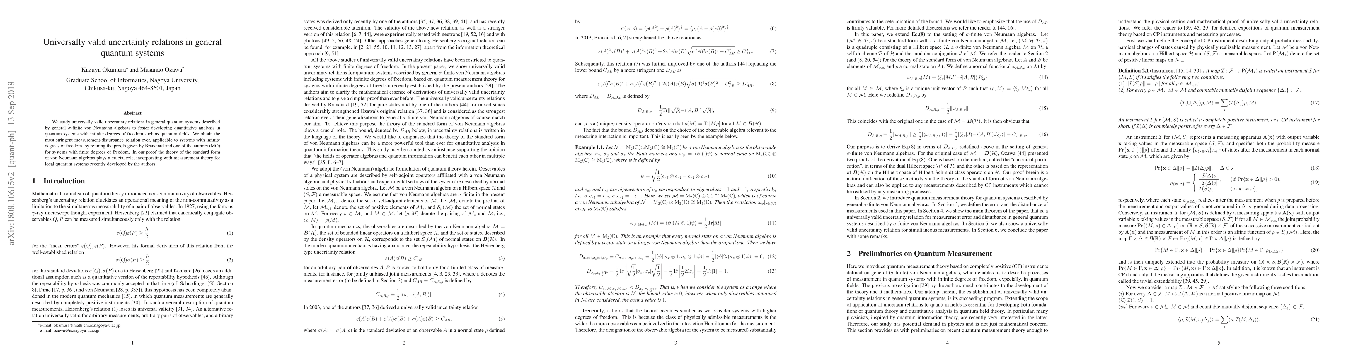 We study universally valid uncertainty relations in general quantum systems described by general $\sigma$-finite von Neumann algebras to foster developing quantitative analysis in quantum systems with infinite degrees of freedom such as quantum fields. We obtain the most stringent measurement-disturbance relation ever, applicable to systems with infinite degrees of freedom, by refining the proofs given by Branciard and one of the authors (MO) for systems with finite degrees of freedom. In our proof the theory of the standard form of von Neumann algebras plays a crucial role, incorporating with measurement theory for local quantum systems recently developed by the authors.