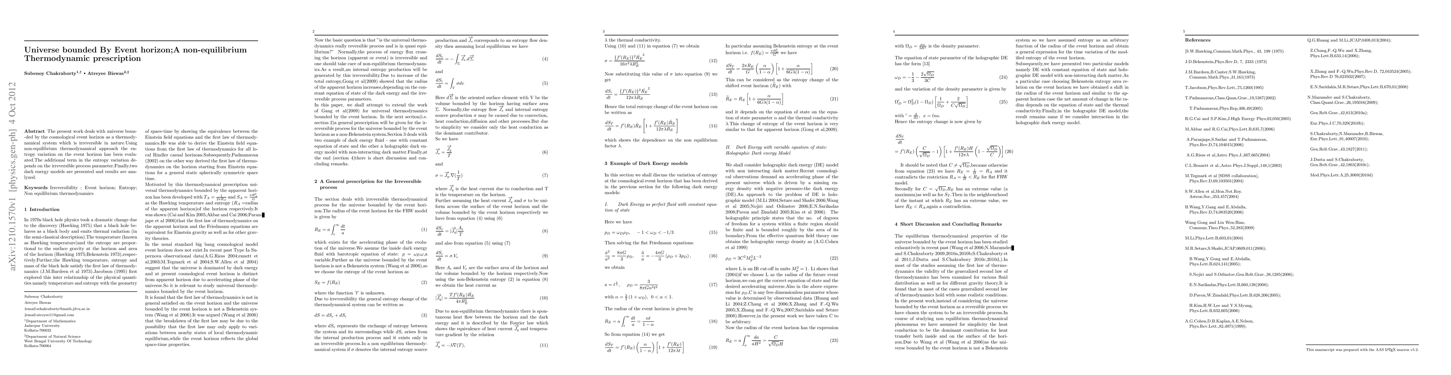 This paper explores a universe enclosed by a cosmological event horizon as a thermodynamic system characterized by irreversible processes. It evaluates entropy variation on the event horizon using non-equilibrium thermodynamics, introducing an additional term dependent on the irreversible process parameter, and analyzes two dark energy models based on these findings.