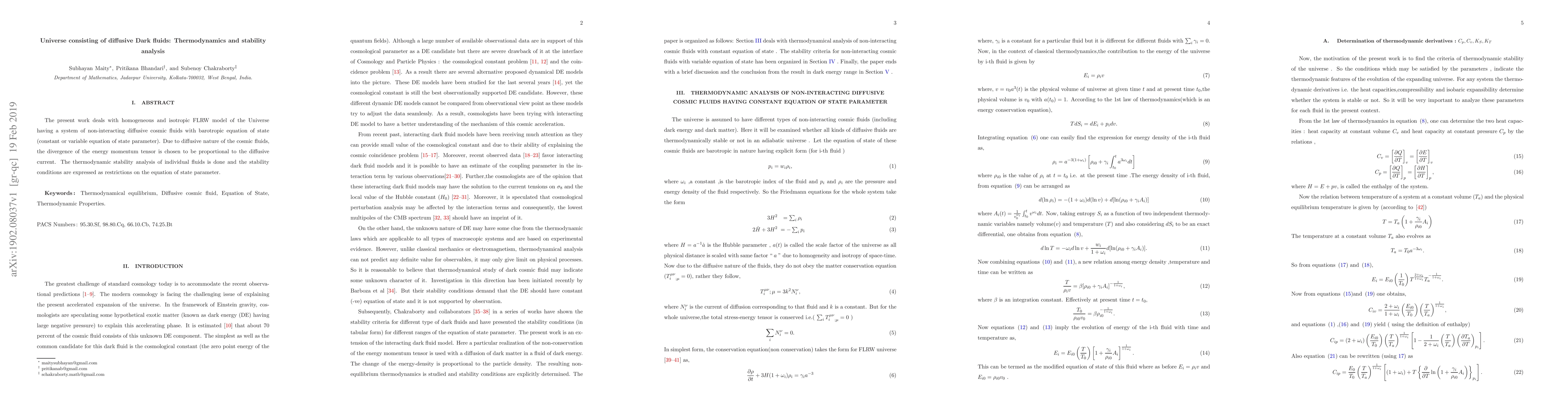 This paper investigates the thermodynamics and stability of a homogeneous and isotropic FLRW Universe model with non-interacting diffusive cosmic fluids, deriving stability conditions based on the proportionality of the energy-momentum tensor divergence to the diffusive current. The analysis imposes restrictions on the fluids' equation of state parameters for thermodynamic stability.
