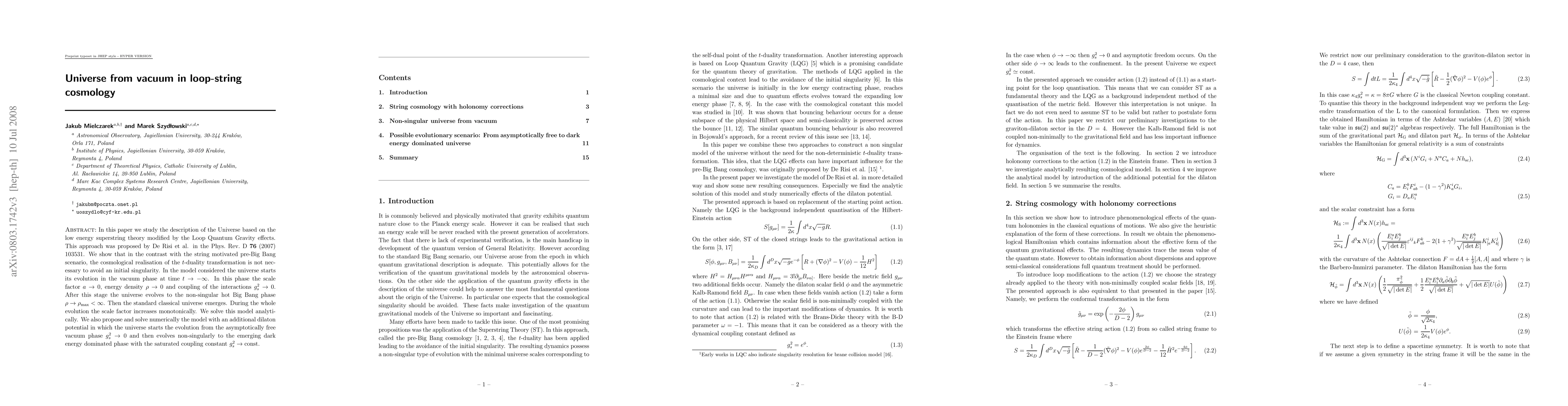 This paper presents a cosmological model based on loop quantum gravity-modified string theory, showing the universe originates from a vacuum phase at t-> -∞, avoiding initial singularities. The model evolves to a non-singular hot Big Bang, then classical universe, with monotonically increasing scale factor. An additional dilaton potential model is also proposed, leading to a dark energy-dominated phase with constant coupling constant.