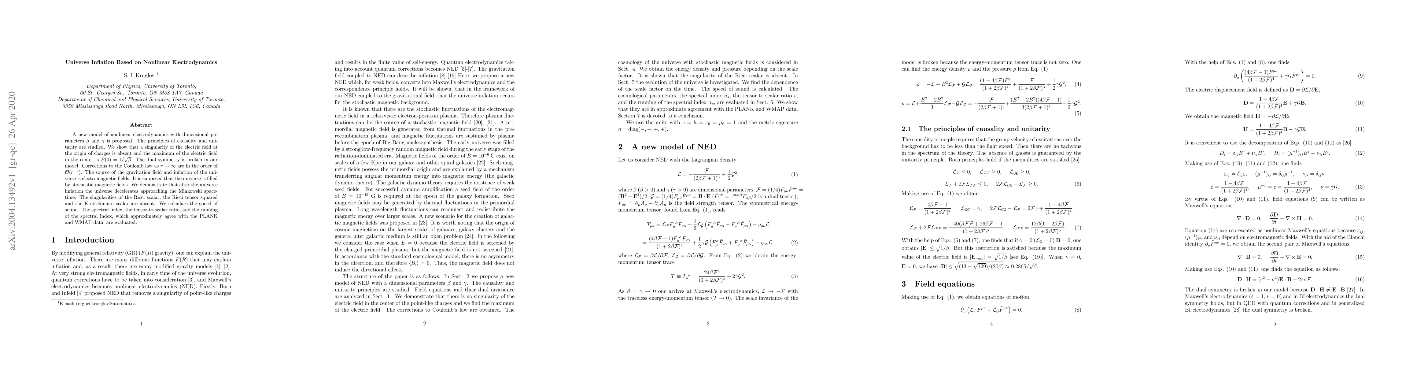 A new model of nonlinear electrodynamics with dimensional parameters $\beta$ and $\gamma$ is proposed. The principles of causality and unitarity are studied. We show that a singularity of the electric field at the origin of charges is absent and the maximum of the electric field in the center is $E(0)=1/\sqrt{\beta}$. The dual symmetry is broken in our model. Corrections to the Coulomb law as $r\rightarrow\infty$ are in the order of ${\cal O}(r^{-4})$. The source of the gravitation field and inflation of the universe is electromagnetic fields. It is supposed that the universe is filled by stochastic magnetic fields. We demonstrate that after the universe inflation the universe decelerates approaching the Minkowski spacetime. The singularities of the Ricci scalar, the Ricci tensor squared and the Kretschmann scalar are absent. We calculate the speed of sound. The spectral index, the tensor-to-scalar ratio, and the running of the spectral index, which approximately agree with the PLANK and WMAP data, are evaluated.