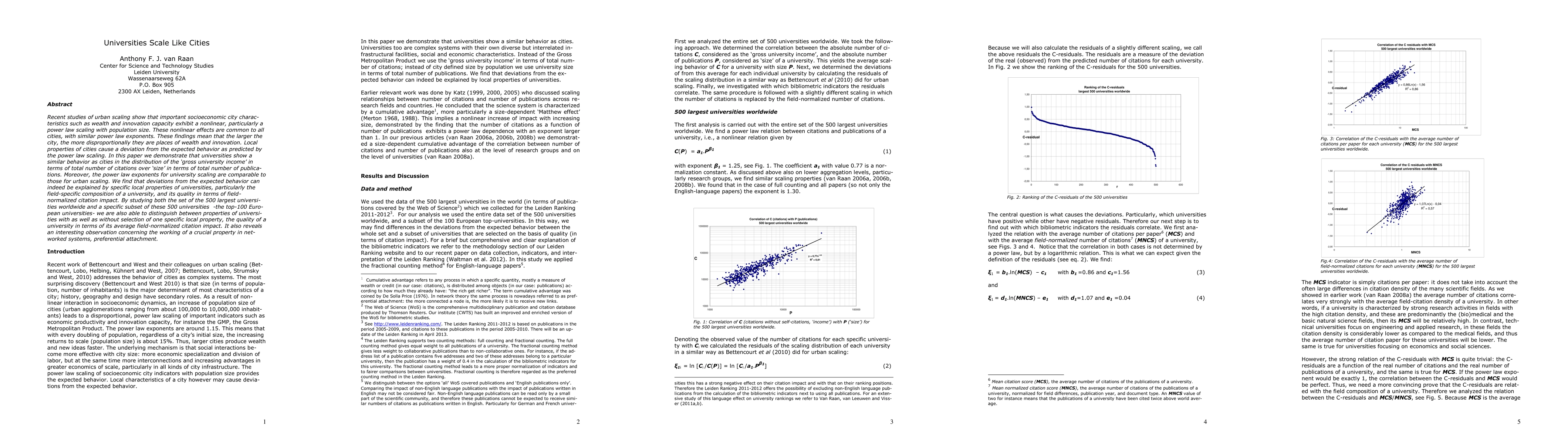 This paper demonstrates that universities exhibit similar scaling behavior to cities, showing a power law relationship between gross university income and total number of citations relative to publication size. Deviations from this scaling are explained by specific local properties, such as field-specific composition and citation impact quality.