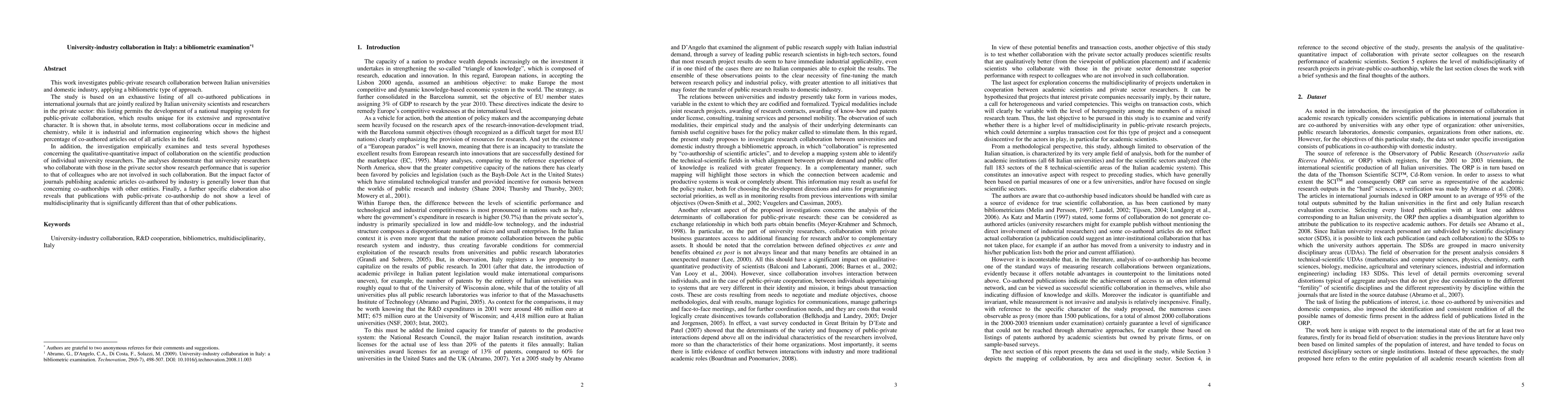 This study uses bibliometric analysis to map public-private research collaborations in Italy, finding that medicine and chemistry lead in absolute terms, while industrial and information engineering show the highest percentage of collaborative articles. Researchers collaborating with industry exhibit superior performance, though their published articles tend to have lower impact factors.