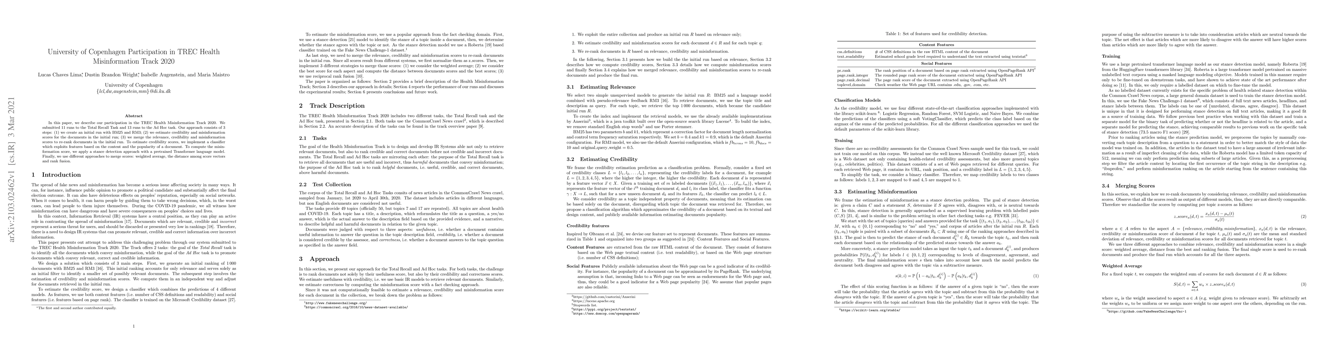 In this paper, we describe our participation in the TREC Health Misinformation Track 2020. We submitted $11$ runs to the Total Recall Task and 13 runs to the Ad Hoc task. Our approach consists of 3 steps: (1) we create an initial run with BM25 and RM3; (2) we estimate credibility and misinformation scores for the documents in the initial run; (3) we merge the relevance, credibility and misinformation scores to re-rank documents in the initial run. To estimate credibility scores, we implement a classifier which exploits features based on the content and the popularity of a document. To compute the misinformation score, we apply a stance detection approach with a pretrained Transformer language model. Finally, we use different approaches to merge scores: weighted average, the distance among score vectors and rank fusion.