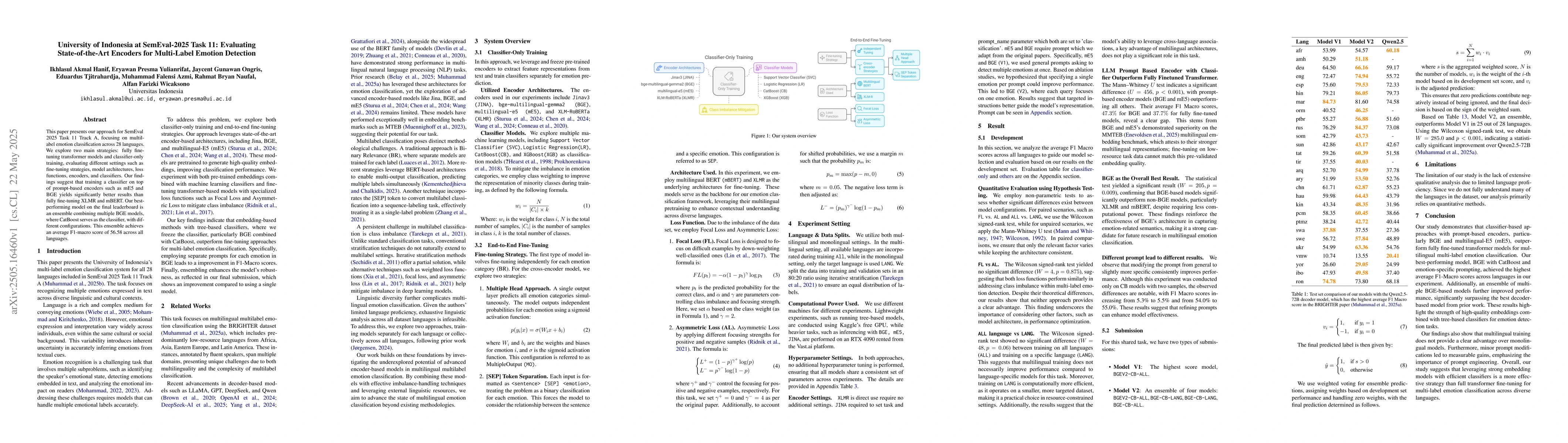 Researchers found that using prompt-based encoders like mE5 and BGE for multilabel emotion detection in 28 languages outperformed fine-tuning transformer models. An ensemble of multiple BGE models with a classifier achieved the best results.