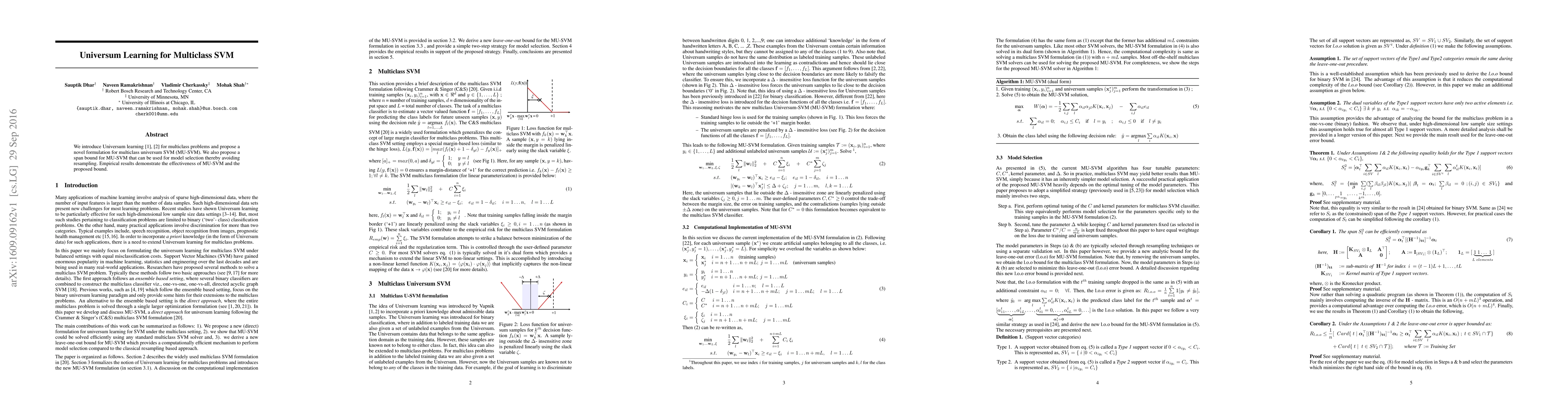 This paper introduces Universum learning for multiclass SVM, proposing a new formulation called MU-SVM and a span bound for model selection without resampling. Empirical results show the effectiveness of the proposed MU-SVM and span bound.