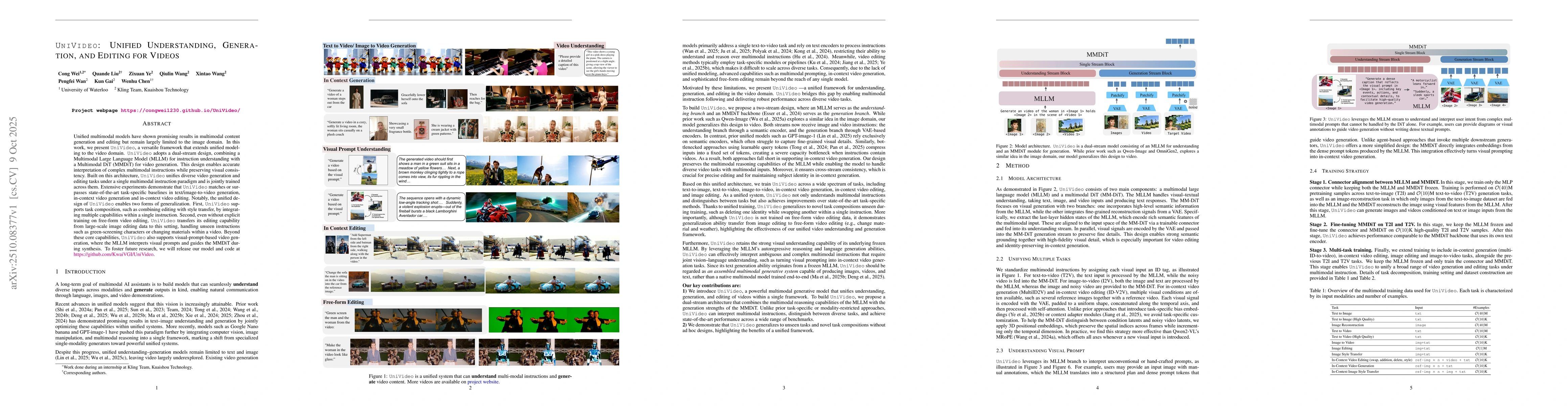 Unified multimodal models have shown promising results in multimodal content generation and editing but remain largely limited to the image domain. In this work, we present UniVideo, a versatile framework that extends unified modeling to the video domain. UniVideo adopts a dual-stream design, combining a Multimodal Large Language Model (MLLM) for instruction understanding with a Multimodal DiT (MMDiT) for video generation. This design enables accurate interpretation of complex multimodal instructions while preserving visual consistency. Built on this architecture, UniVideo unifies diverse video generation and editing tasks under a single multimodal instruction paradigm and is jointly trained across them. Extensive experiments demonstrate that UniVideo matches or surpasses state-of-the-art task-specific baselines in text/image-to-video generation, in-context video generation and in-context video editing. Notably, the unified design of UniVideo enables two forms of generalization. First, UniVideo supports task composition, such as combining editing with style transfer, by integrating multiple capabilities within a single instruction. Second, even without explicit training on free-form video editing, UniVideo transfers its editing capability from large-scale image editing data to this setting, handling unseen instructions such as green-screening characters or changing materials within a video. Beyond these core capabilities, UniVideo also supports visual-prompt-based video generation, where the MLLM interprets visual prompts and guides the MMDiT during synthesis. To foster future research, we will release our model and code.