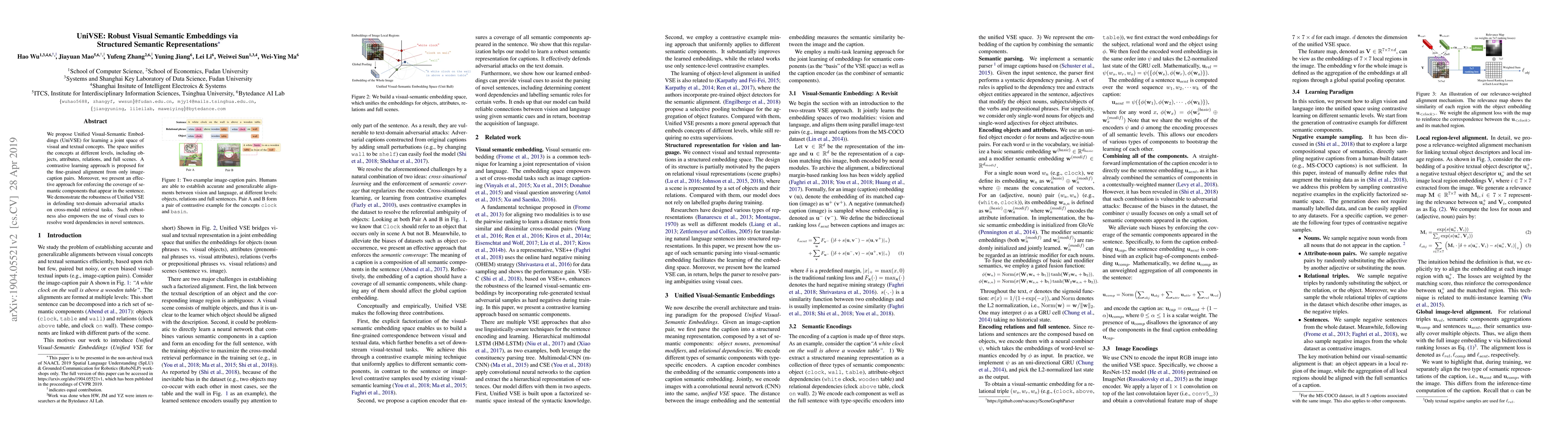UniVSE proposes a method for creating robust visual-semantic embeddings by unifying concepts at various levels through structured representations and contrastive learning from image-caption pairs. The model demonstrates robustness against text-domain adversarial attacks and enhances cross-modal retrieval tasks.