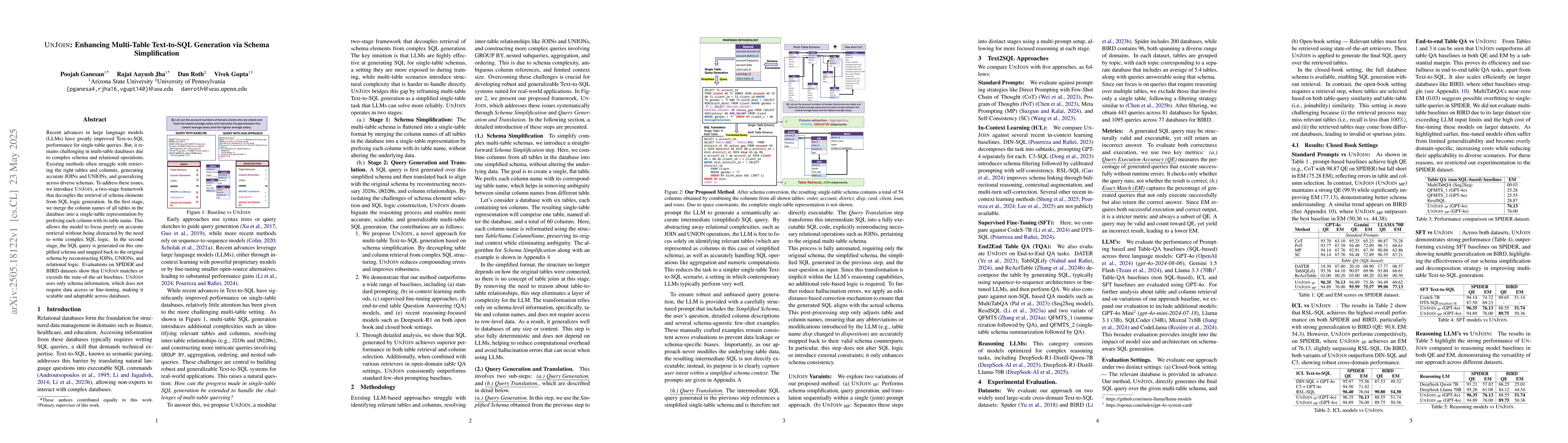 UNJOIN enhances multi-table text-to-SQL generation by simplifying schema through a two-stage framework that retrieves schema elements and generates SQL queries.