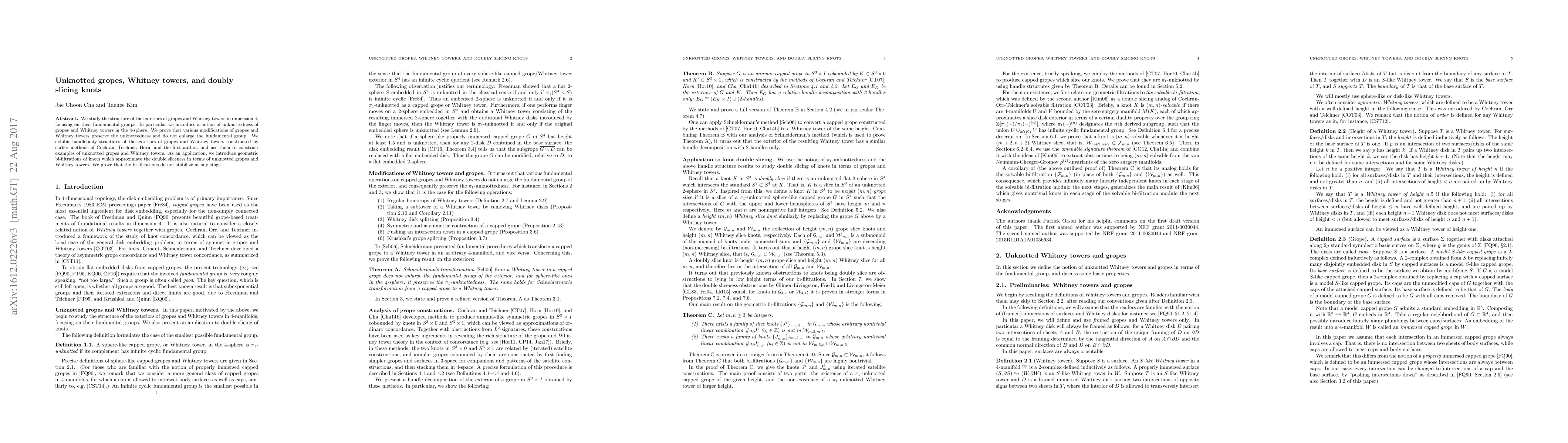 This paper explores the fundamental groups of the exteriors of gropes and Whitney towers in 4 dimensions, introducing the concept of unknottedness. It proves that certain modifications maintain unknottedness without increasing the fundamental group and constructs examples using handlebody structures. Additionally, it presents geometric bi-filtrations of knots that approximate double sliceness, showing they do not stabilize.