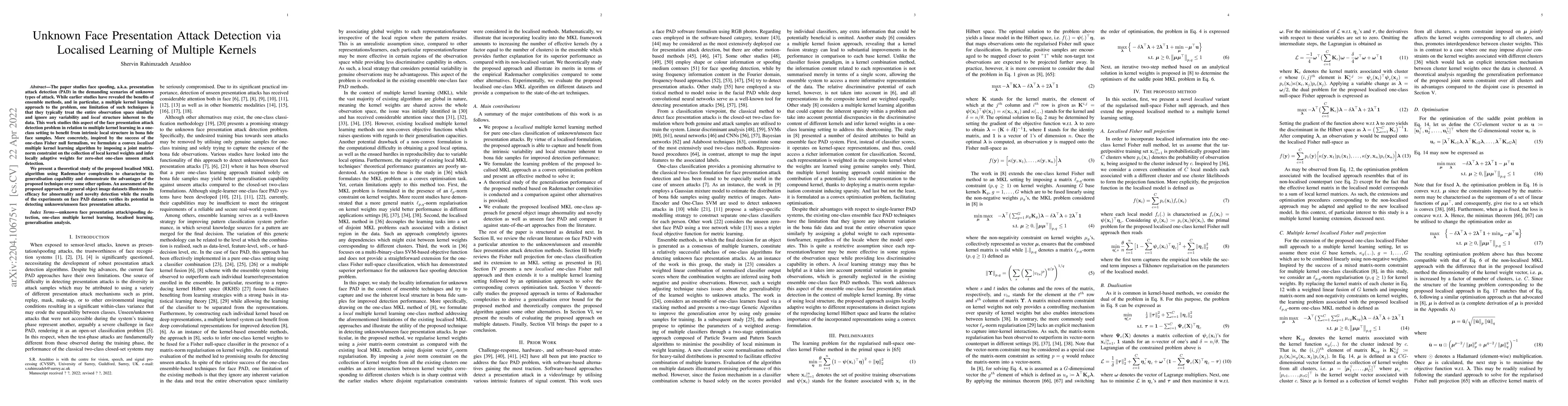 This paper proposes a localised multiple kernel learning algorithm for detecting unknown face presentation attacks by leveraging intrinsic local structures in bona fide face samples. The method imposes a joint matrix-norm constraint on local kernel weights, enabling zero-shot detection of unseen attacks, and demonstrates superior performance over other techniques in both general object datasets and specific face presentation attack detection scenarios.