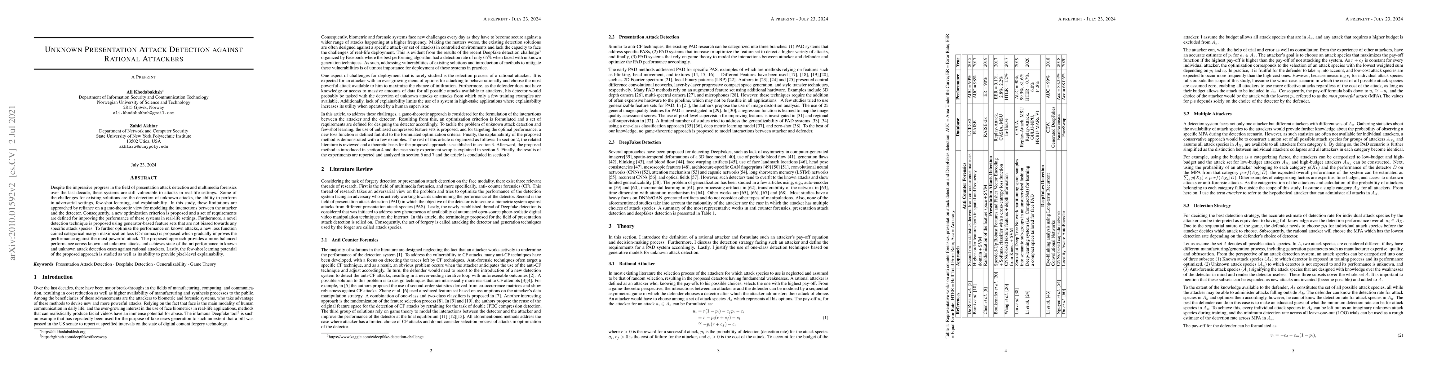 A new approach to presentation attack detection against rational attackers is proposed, using a game-theoretic view and generator-based feature sets that achieve state-of-the-art performance in both known and unknown attack cases.