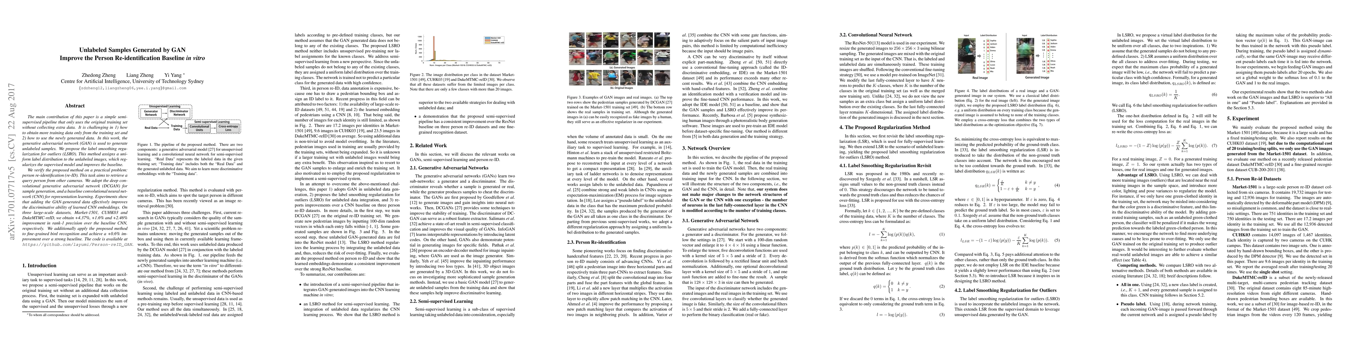 The main contribution of this paper is a simple semi-supervised pipeline that only uses the original training set without collecting extra data. It is challenging in 1) how to obtain more training data only from the training set and 2) how to use the newly generated data. In this work, the generative adversarial network (GAN) is used to generate unlabeled samples. We propose the label smoothing regularization for outliers (LSRO). This method assigns a uniform label distribution to the unlabeled images, which regularizes the supervised model and improves the baseline. We verify the proposed method on a practical problem: person re-identification (re-ID). This task aims to retrieve a query person from other cameras. We adopt the deep convolutional generative adversarial network (DCGAN) for sample generation, and a baseline convolutional neural network (CNN) for representation learning. Experiments show that adding the GAN-generated data effectively improves the discriminative ability of learned CNN embeddings. On three large-scale datasets, Market-1501, CUHK03 and DukeMTMC-reID, we obtain +4.37%, +1.6% and +2.46% improvement in rank-1 precision over the baseline CNN, respectively. We additionally apply the proposed method to fine-grained bird recognition and achieve a +0.6% improvement over a strong baseline. The code is available at https://github.com/layumi/Person-reID_GAN.
