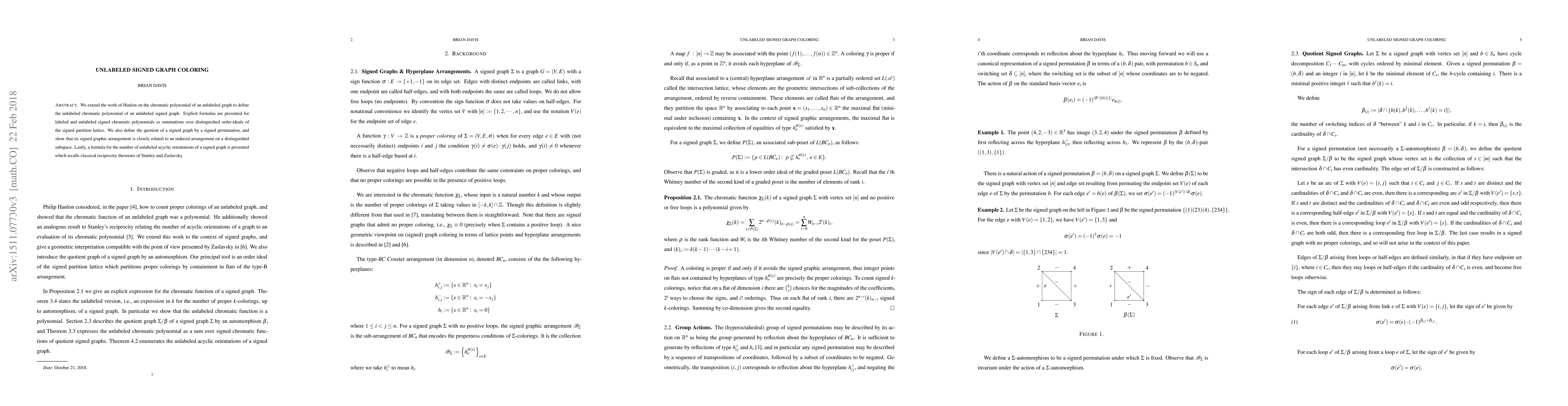 We extend the work of Hanlon on the chromatic polynomial of an unlabeled graph to define the unlabeled chromatic polynomial of an unlabeled signed graph. Explicit formulas are presented for labeled and unlabeled signed chromatic polynomials as summations over distinguished order-ideals of the signed partition lattice. We also define the quotient of a signed graph by a signed permutation, and show that its signed graphic arrangement is closely related to an induced arrangement on a distinguished subspace. Lastly, a formula for the number of unlabeled acyclic orientations of a signed graph is presented which recalls classical reciprocity theorems of Stanley and Zaslavsky.