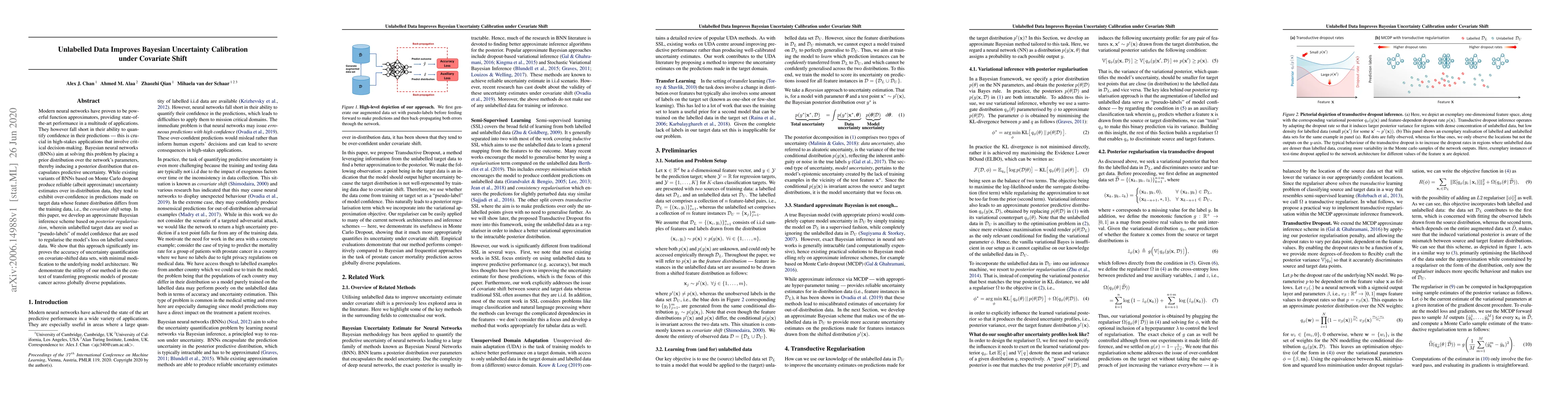 Modern neural networks have proven to be powerful function approximators, providing state-of-the-art performance in a multitude of applications. They however fall short in their ability to quantify confidence in their predictions - this is crucial in high-stakes applications that involve critical decision-making. Bayesian neural networks (BNNs) aim at solving this problem by placing a prior distribution over the network's parameters, thereby inducing a posterior distribution that encapsulates predictive uncertainty. While existing variants of BNNs based on Monte Carlo dropout produce reliable (albeit approximate) uncertainty estimates over in-distribution data, they tend to exhibit over-confidence in predictions made on target data whose feature distribution differs from the training data, i.e., the covariate shift setup. In this paper, we develop an approximate Bayesian inference scheme based on posterior regularisation, wherein unlabelled target data are used as "pseudo-labels" of model confidence that are used to regularise the model's loss on labelled source data. We show that this approach significantly improves the accuracy of uncertainty quantification on covariate-shifted data sets, with minimal modification to the underlying model architecture. We demonstrate the utility of our method in the context of transferring prognostic models of prostate cancer across globally diverse populations.