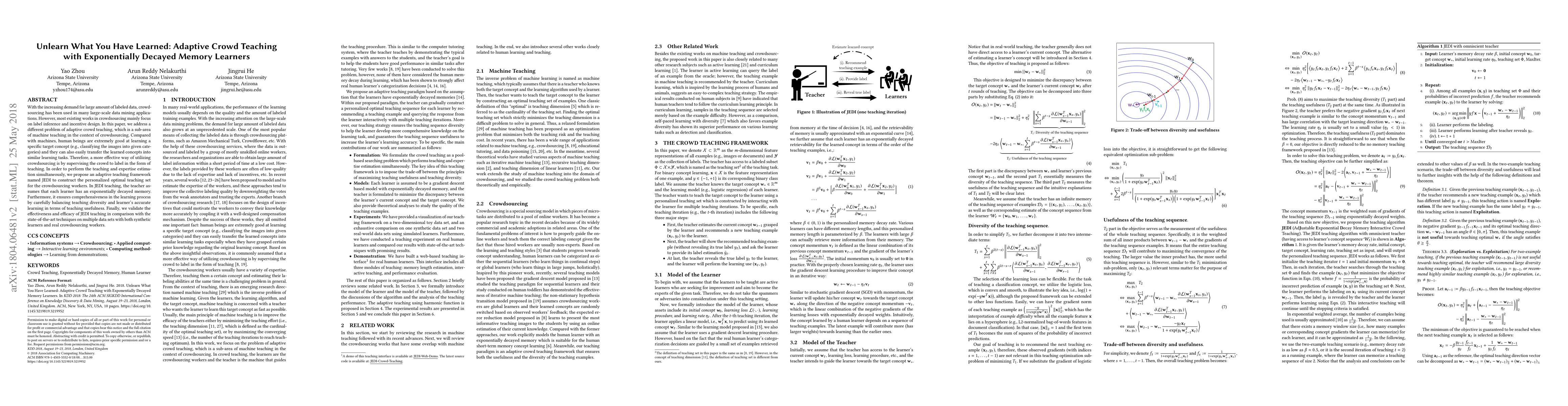 This paper proposes JEDI, an adaptive crowd teaching framework that leverages exponentially decayed memory learners to optimize teaching sets for crowdsourcing workers. The framework aims to enhance the teaching process by balancing teaching diversity and learner accuracy, demonstrating effectiveness through comparisons with state-of-the-art techniques on various datasets.