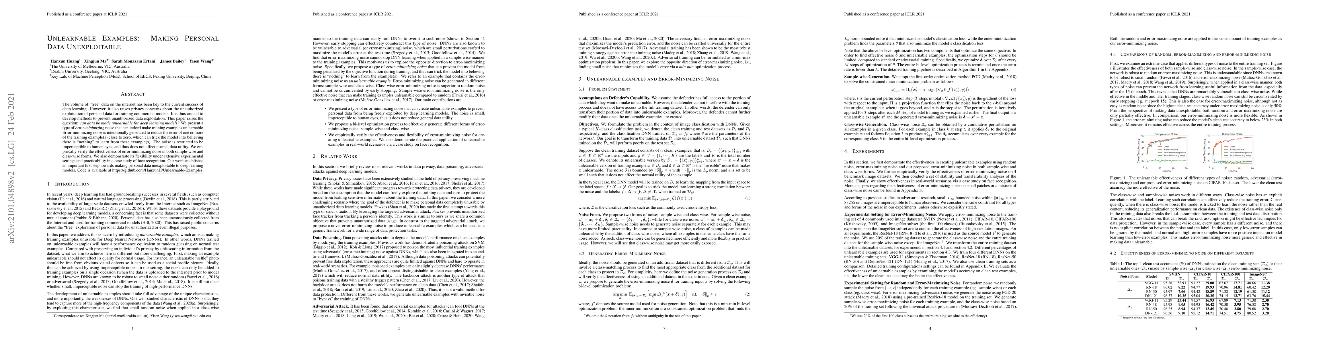 This paper proposes a method of error-minimizing noise to make personal data unlearnable for deep learning models, ensuring that such data remains imperceptible to humans while effectively preventing unauthorized exploitation. The effectiveness of this approach is demonstrated through extensive experiments and a case study in face recognition.