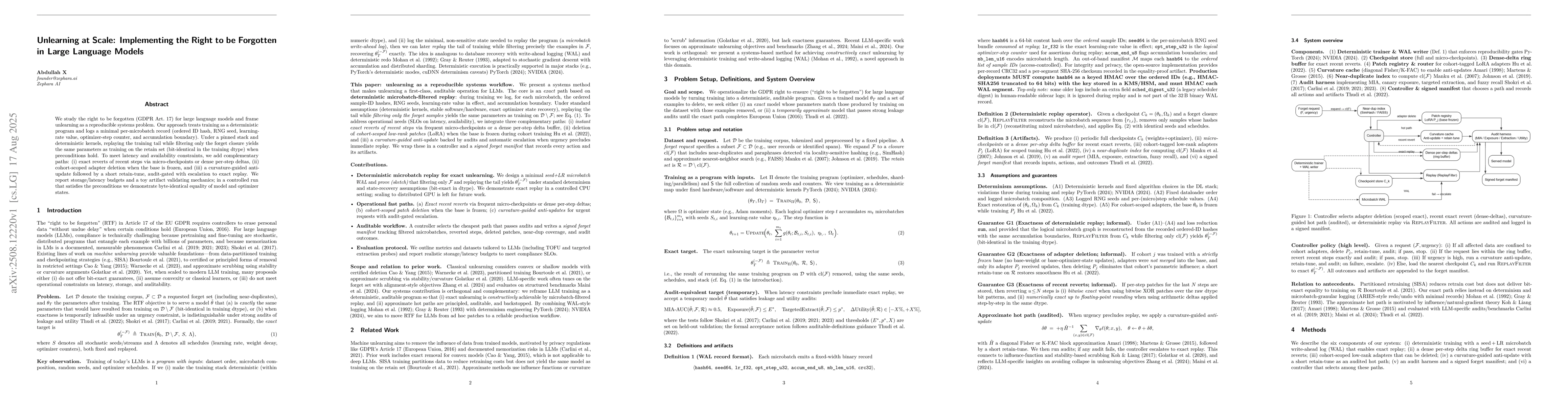 We study the right to be forgotten (GDPR Art. 17) for large language models and frame unlearning as a reproducible systems problem. Our approach treats training as a deterministic program and logs a minimal per-microbatch record (ordered ID hash, RNG seed, learning-rate value, optimizer-step counter, and accumulation boundary). Under a pinned stack and deterministic kernels, replaying the training tail while filtering only the forget closure yields the same parameters as training on the retain set (bit-identical in the training dtype) when preconditions hold. To meet latency and availability constraints, we add complementary paths: (i) exact reverts of recent steps via micro-checkpoints or dense per-step deltas, (ii) cohort-scoped adapter deletion when the base is frozen, and (iii) a curvature-guided anti-update followed by a short retain-tune, audit-gated with escalation to exact replay. We report storage/latency budgets and a toy artifact validating mechanics; in a controlled run that satisfies the preconditions we demonstrate byte-identical equality of model and optimizer states.