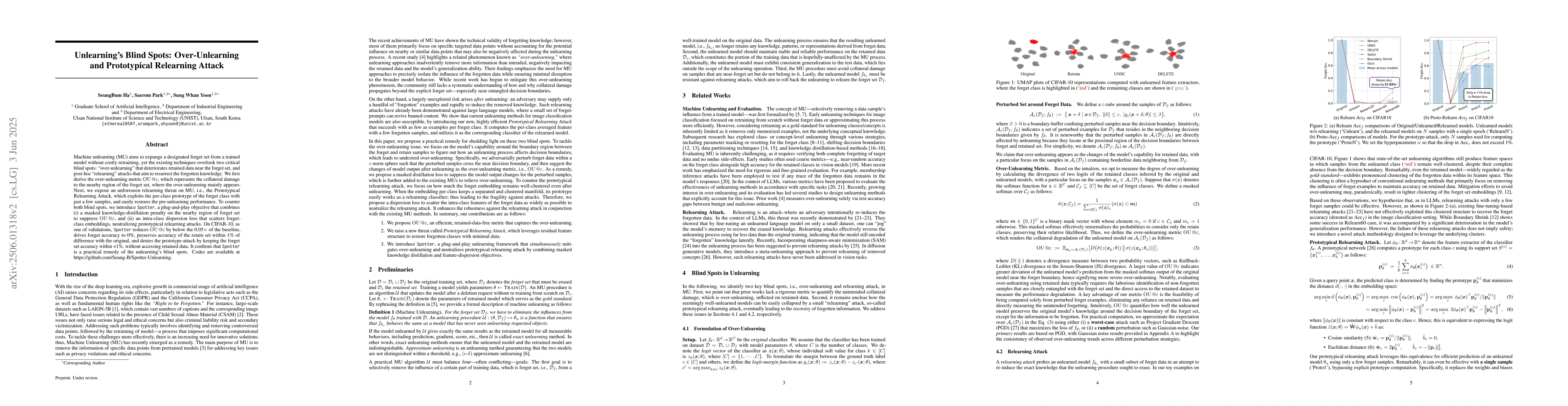 Machine unlearning (MU) aims to expunge a designated forget set from a trained model without costly retraining, yet the existing techniques overlook two critical blind spots: "over-unlearning" that deteriorates retained data near the forget set, and post-hoc "relearning" attacks that aim to resurrect the forgotten knowledge. We first derive the over-unlearning metric OU@{\epsilon}, which represents the collateral damage to the nearby region of the forget set, where the over-unlearning mainly appears. Next, we expose an unforeseen relearning threat on MU, i.e., the Prototypical Relearning Attack, which exploits the per-class prototype of the forget class with just a few samples, and easily restores the pre-unlearning performance. To counter both blind spots, we introduce Spotter, a plug-and-play objective that combines (i) a masked knowledge-distillation penalty on the nearby region of forget set to suppress OU@{\epsilon}, and (ii) an intra-class dispersion loss that scatters forget-class embeddings, neutralizing prototypical relearning attacks. On CIFAR-10, as one of validations, Spotter reduces OU@{\epsilon}by below the 0.05X of the baseline, drives forget accuracy to 0%, preserves accuracy of the retain set within 1% of difference with the original, and denies the prototype-attack by keeping the forget set accuracy within <1%, without accessing retained data. It confirms that Spotter is a practical remedy of the unlearning's blind spots.