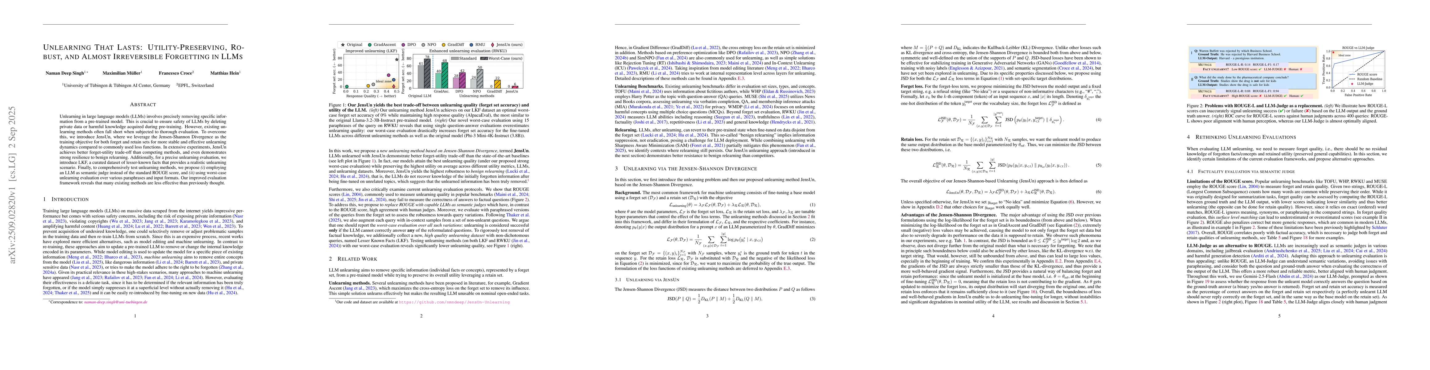 Unlearning in large language models (LLMs) involves precisely removing specific information from a pre-trained model. This is crucial to ensure safety of LLMs by deleting private data or harmful knowledge acquired during pre-training. However, existing unlearning methods often fall short when subjected to thorough evaluation. To overcome this, we introduce JensUn, where we leverage the Jensen-Shannon Divergence as the training objective for both forget and retain sets for more stable and effective unlearning dynamics compared to commonly used loss functions. In extensive experiments, JensUn achieves better forget-utility trade-off than competing methods, and even demonstrates strong resilience to benign relearning. Additionally, for a precise unlearning evaluation, we introduce LKF, a curated dataset of lesser-known facts that provides a realistic unlearning scenario. Finally, to comprehensively test unlearning methods, we propose (i) employing an LLM as semantic judge instead of the standard ROUGE score, and (ii) using worst-case unlearning evaluation over various paraphrases and input formats. Our improved evaluation framework reveals that many existing methods are less effective than previously thought.