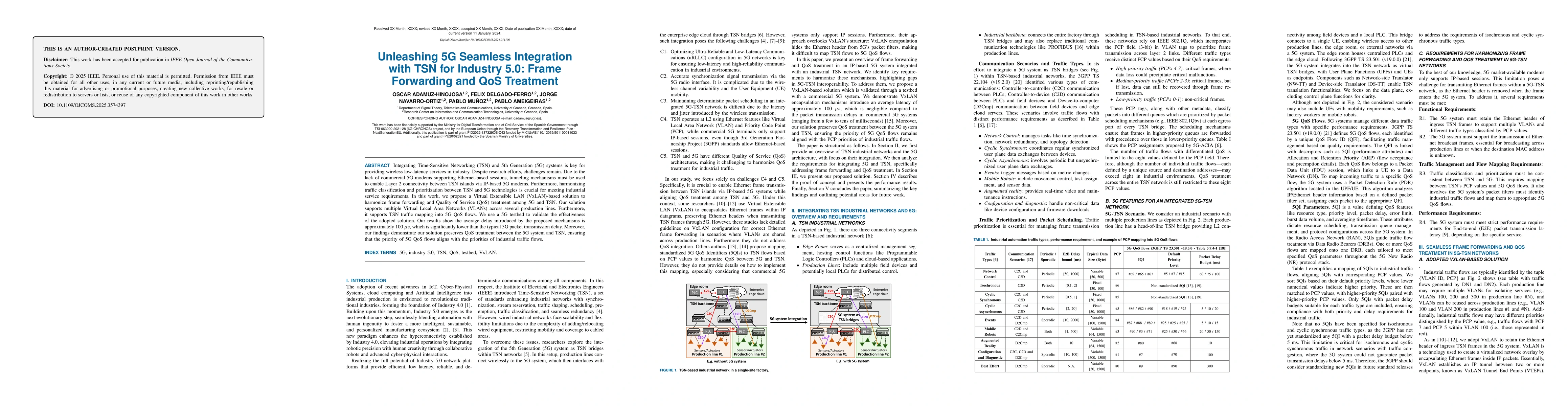The paper proposes a Virtual Extensible LAN (VxLAN)-based solution to harmonize frame forwarding and Quality of Service (QoS) treatment between 5G and TSN, validated using a 5G testbed.