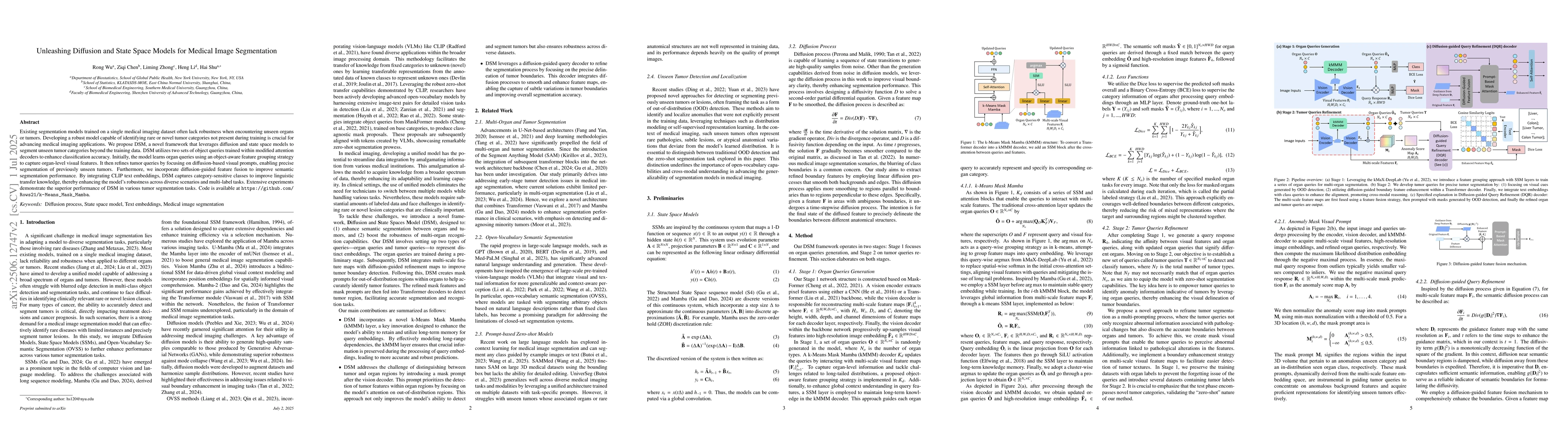 Existing segmentation models trained on a single medical imaging dataset often lack robustness when encountering unseen organs or tumors. Developing a robust model capable of identifying rare or novel tumor categories not present during training is crucial for advancing medical imaging applications. We propose DSM, a novel framework that leverages diffusion and state space models to segment unseen tumor categories beyond the training data. DSM utilizes two sets of object queries trained within modified attention decoders to enhance classification accuracy. Initially, the model learns organ queries using an object-aware feature grouping strategy to capture organ-level visual features. It then refines tumor queries by focusing on diffusion-based visual prompts, enabling precise segmentation of previously unseen tumors. Furthermore, we incorporate diffusion-guided feature fusion to improve semantic segmentation performance. By integrating CLIP text embeddings, DSM captures category-sensitive classes to improve linguistic transfer knowledge, thereby enhancing the model's robustness across diverse scenarios and multi-label tasks. Extensive experiments demonstrate the superior performance of DSM in various tumor segmentation tasks. Code is available at https://github.com/Rows21/KMax-Mamba.