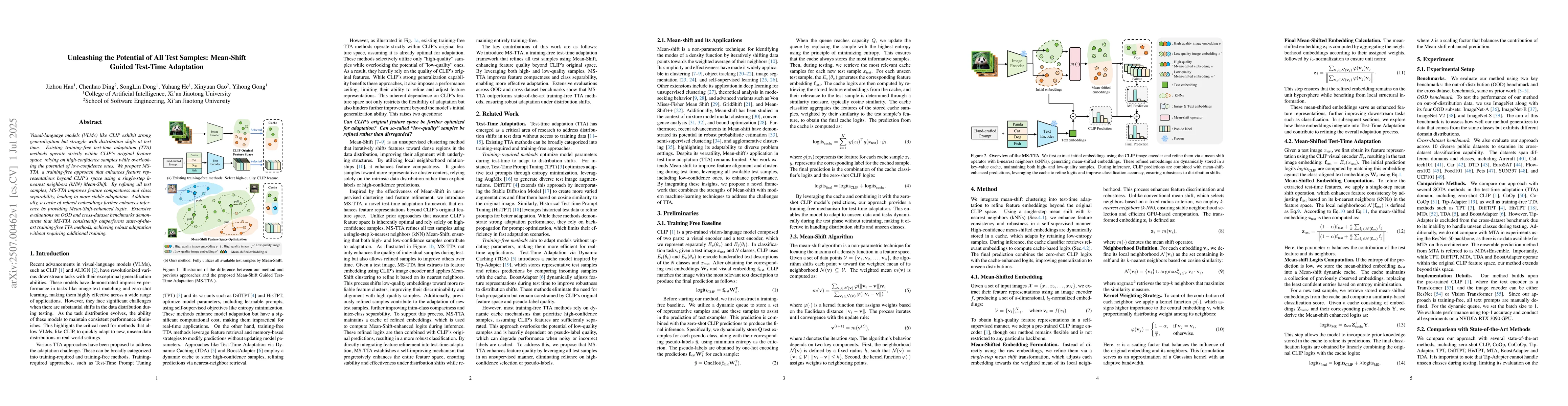 The paper introduces MS-TTA, a training-free test-time adaptation method for visual-language models like CLIP. It enhances feature representations using a single-step k-nearest neighbors Mean-Shift, refining all test samples for improved compactness and class separability. This leads to consistent performance gains over state-of-the-art methods on OOD and cross-dataset benchmarks without additional training.