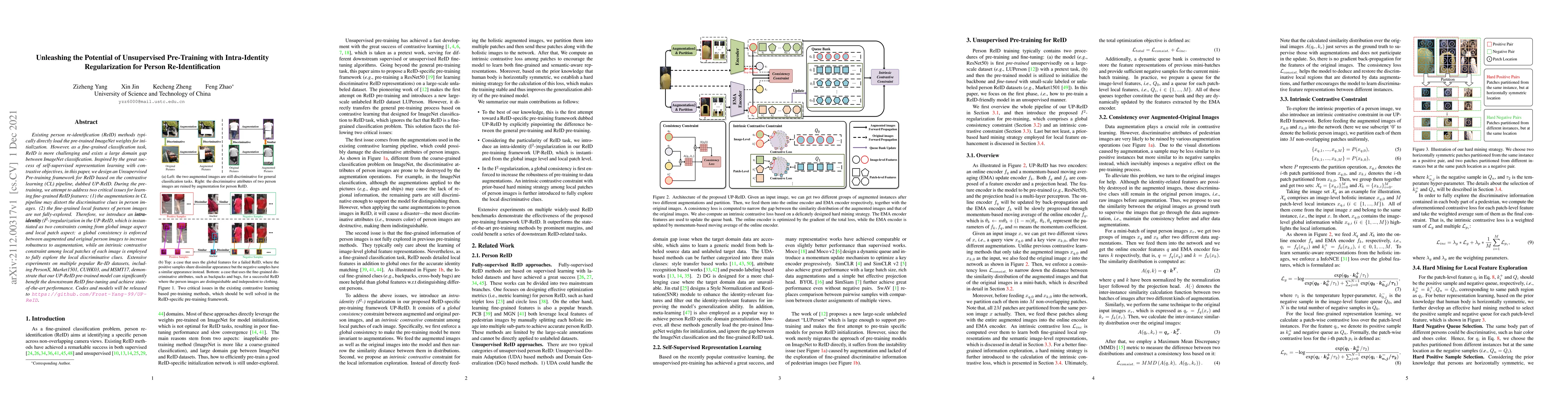 This paper proposes an Unsupervised Pre-training framework (UP-ReID) for person re-identification using contrastive learning with intra-identity regularization to address domain gap issues and enhance fine-grained feature extraction. Experiments show superior performance on multiple ReID datasets compared to existing methods.