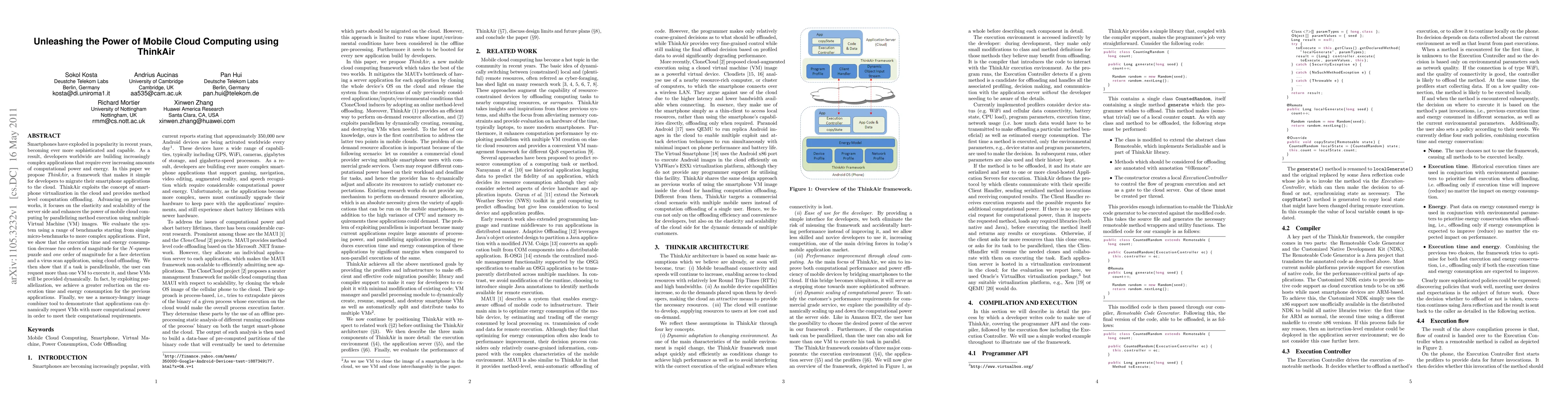 Smartphones have exploded in popularity in recent years, becoming ever more sophisticated and capable. As a result, developers worldwide are building increasingly complex applications that require ever increasing amounts of computational power and energy. In this paper we propose ThinkAir, a framework that makes it simple for developers to migrate their smartphone applications to the cloud. ThinkAir exploits the concept of smartphone virtualization in the cloud and provides method level computation offloading. Advancing on previous works, it focuses on the elasticity and scalability of the server side and enhances the power of mobile cloud computing by parallelizing method execution using multiple Virtual Machine (VM) images. We evaluate the system using a range of benchmarks starting from simple micro-benchmarks to more complex applications. First, we show that the execution time and energy consumption decrease two orders of magnitude for the N-queens puzzle and one order of magnitude for a face detection and a virus scan application, using cloud offloading. We then show that if a task is parallelizable, the user can request more than one VM to execute it, and these VMs will be provided dynamically. In fact, by exploiting parallelization, we achieve a greater reduction on the execution time and energy consumption for the previous applications. Finally, we use a memory-hungry image combiner tool to demonstrate that applications can dynamically request VMs with more computational power in order to meet their computational requirements.