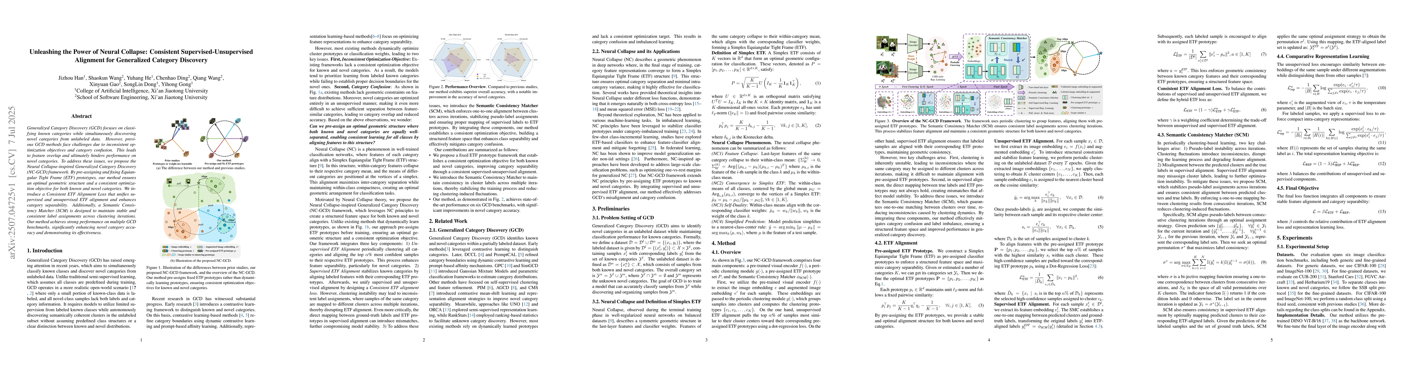 Generalized Category Discovery (GCD) focuses on classifying known categories while simultaneously discovering novel categories from unlabeled data. However, previous GCD methods face challenges due to inconsistent optimization objectives and category confusion. This leads to feature overlap and ultimately hinders performance on novel categories. To address these issues, we propose the Neural Collapse-inspired Generalized Category Discovery (NC-GCD) framework. By pre-assigning and fixing Equiangular Tight Frame (ETF) prototypes, our method ensures an optimal geometric structure and a consistent optimization objective for both known and novel categories. We introduce a Consistent ETF Alignment Loss that unifies supervised and unsupervised ETF alignment and enhances category separability. Additionally, a Semantic Consistency Matcher (SCM) is designed to maintain stable and consistent label assignments across clustering iterations. Our method achieves strong performance on multiple GCD benchmarks, significantly enhancing novel category accuracy and demonstrating its effectiveness.